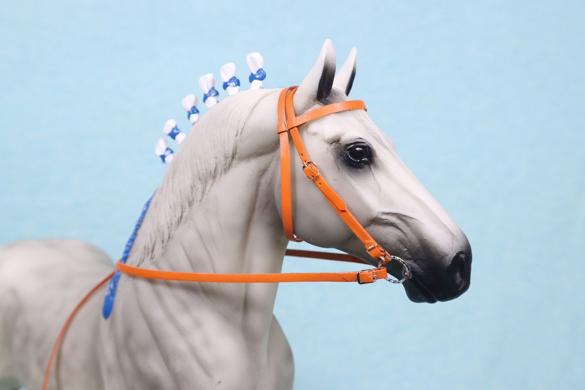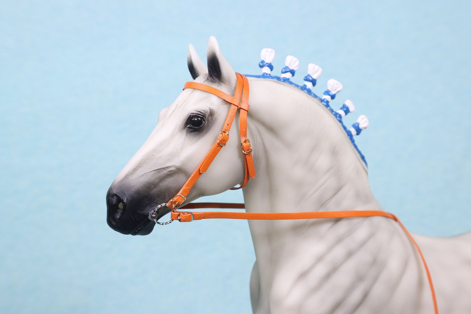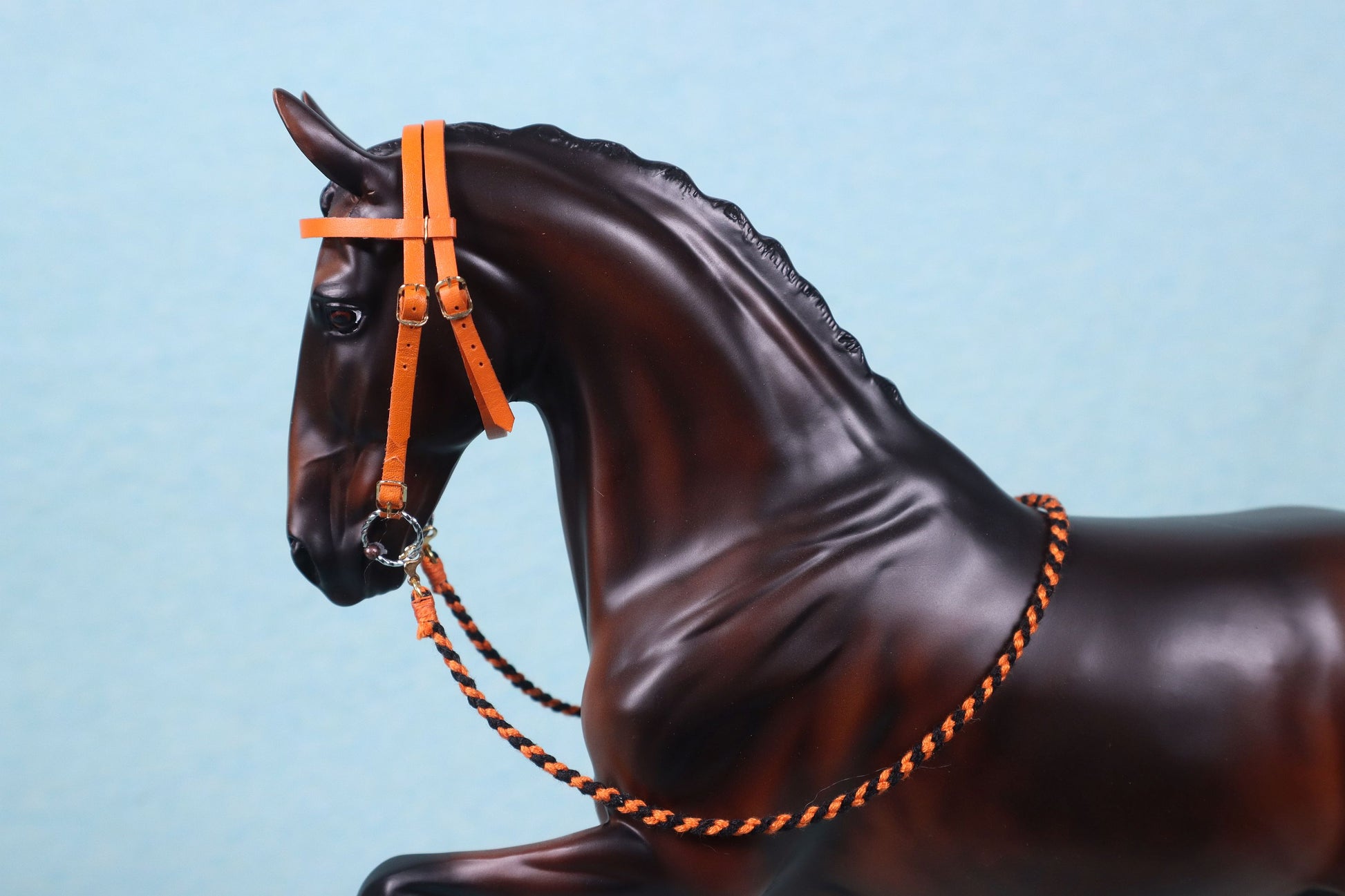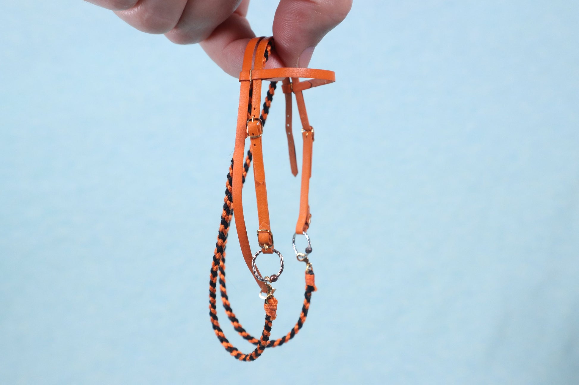 This is an orange leather snaffle bridle, made on the Stone Horses standing drafter mold. It is made from kangaroo leather lace. Features include working tongue buckles all around, and a snaffle bit that I made. The hardware on the headstall is gold in color.