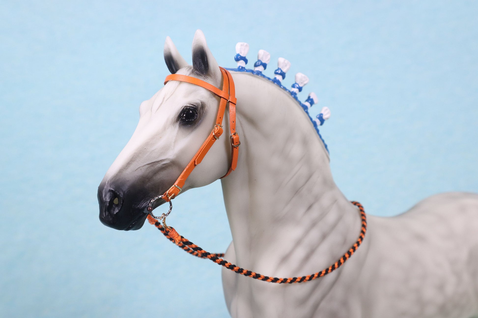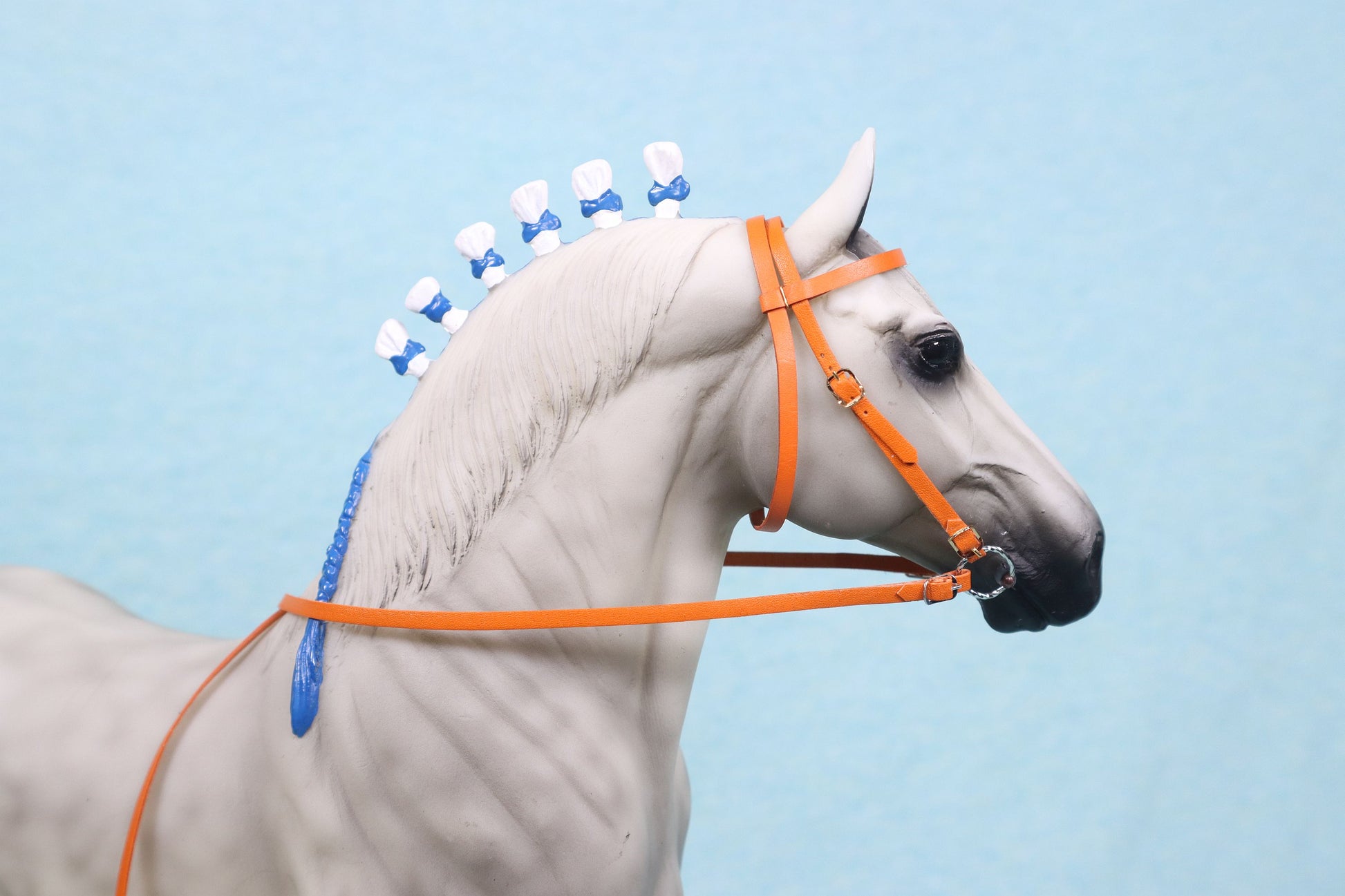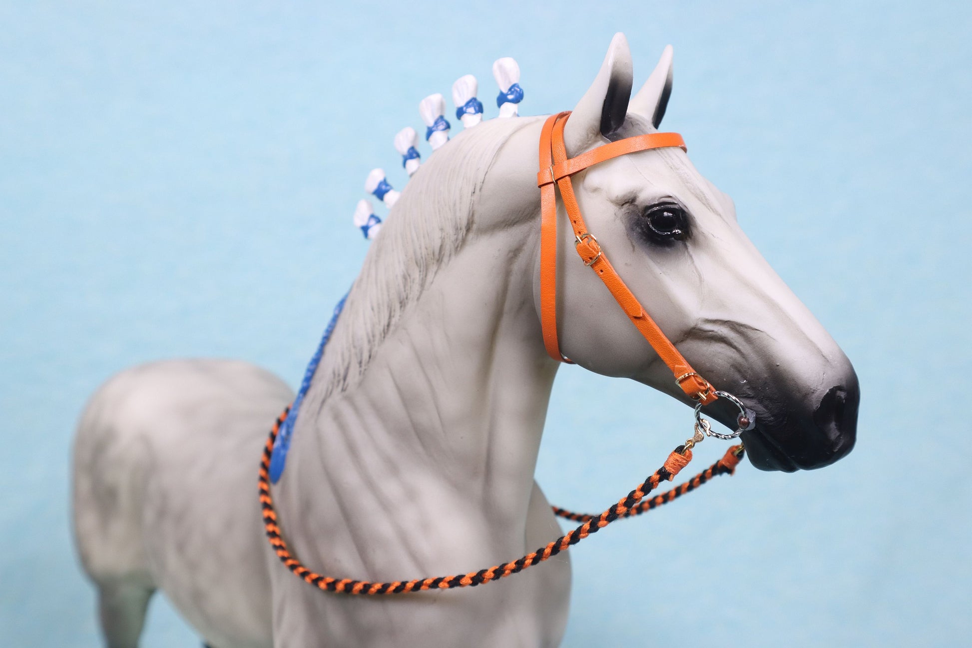 This is an orange leather snaffle bridle, made on the Stone Horses standing drafter mold. It is made from kangaroo leather lace. Features include working tongue buckles all around, and a snaffle bit that I made. The hardware on the headstall is gold in color.