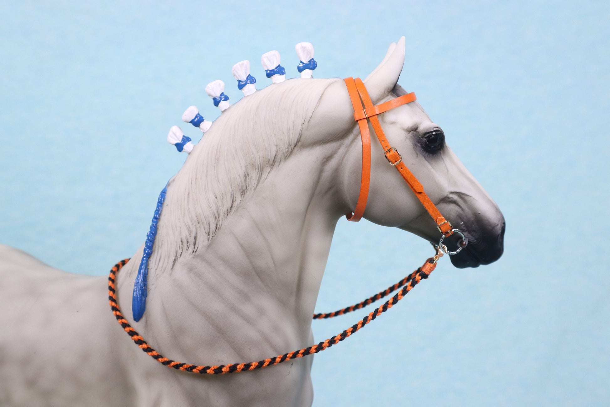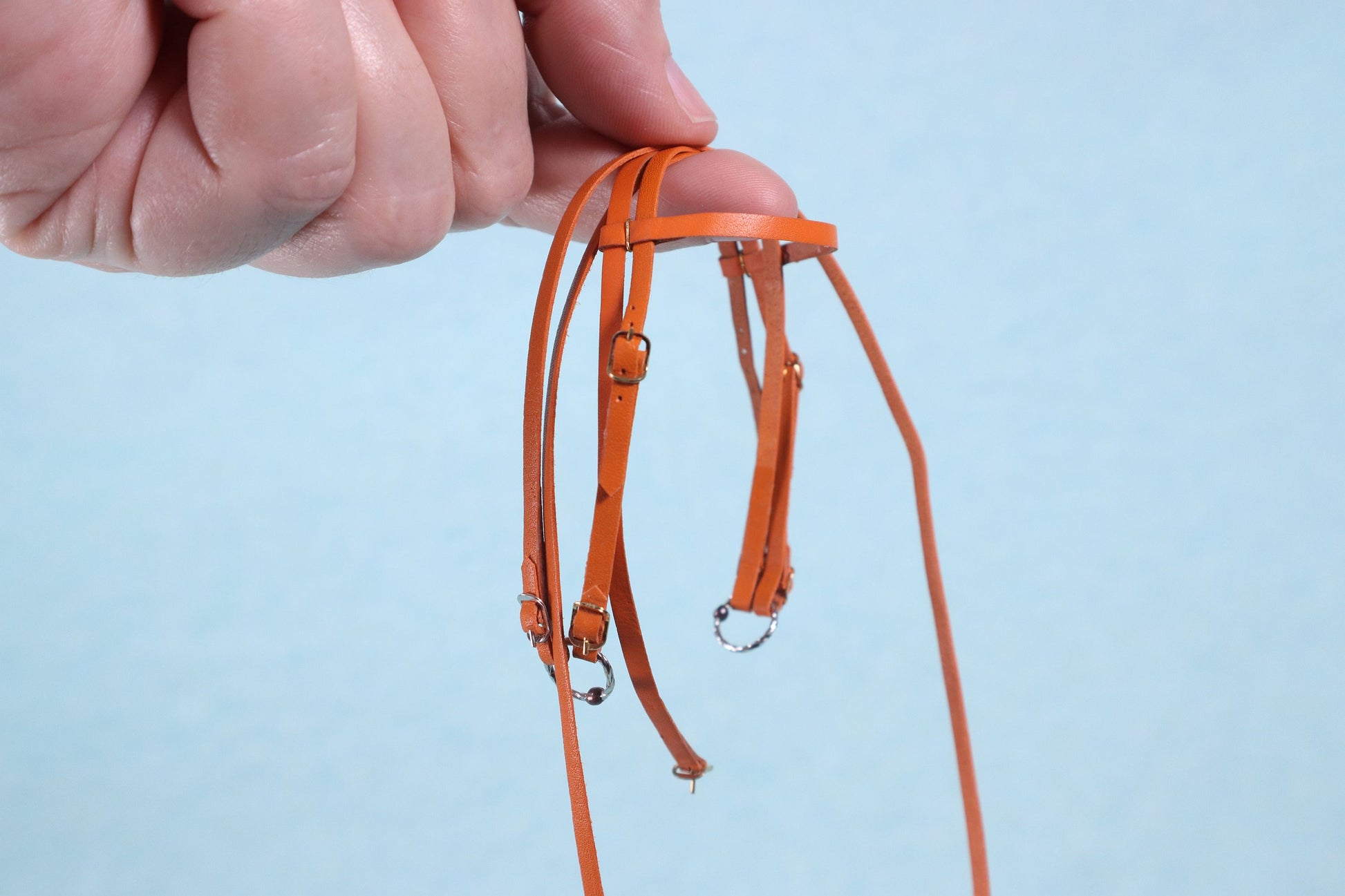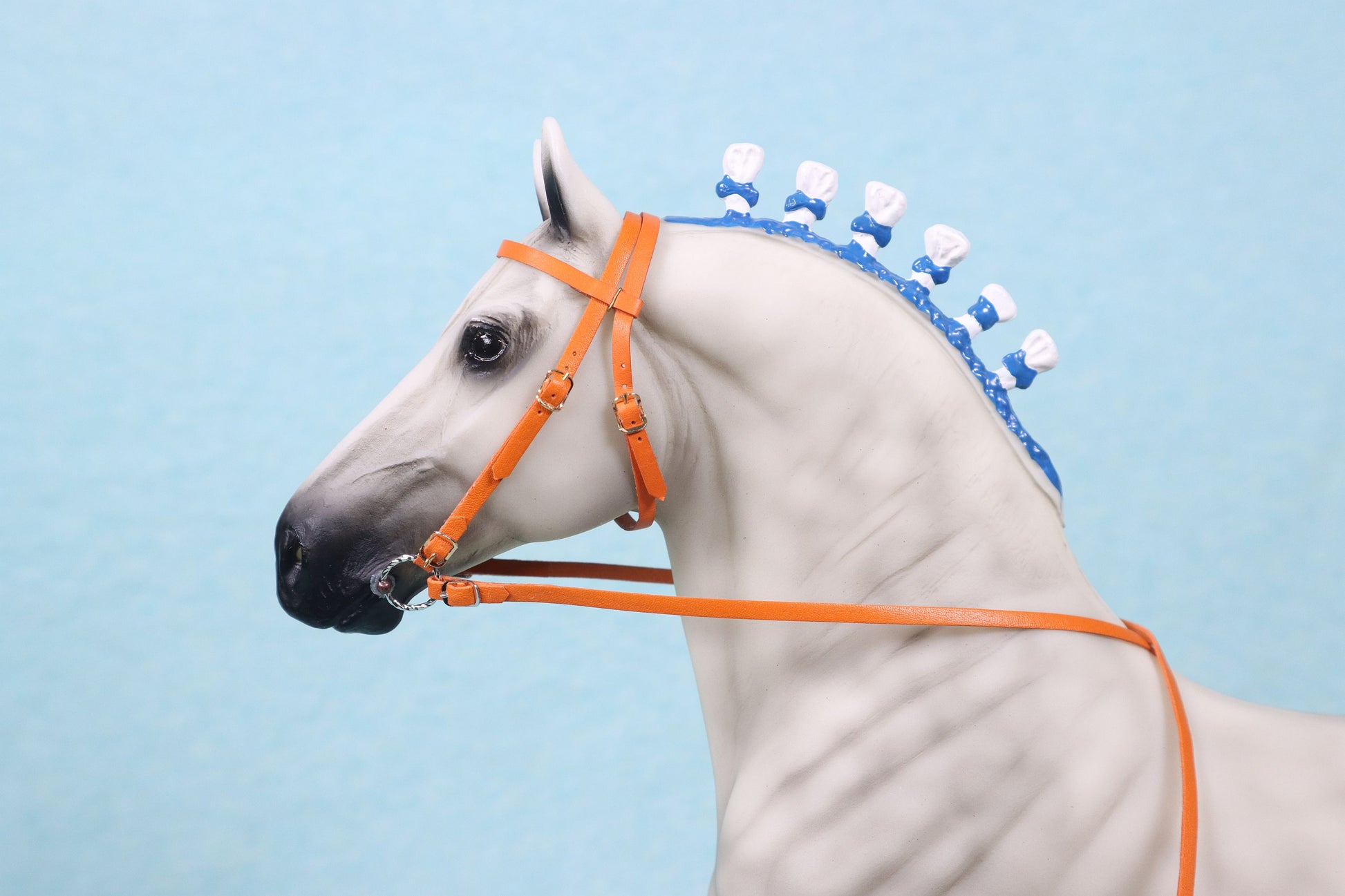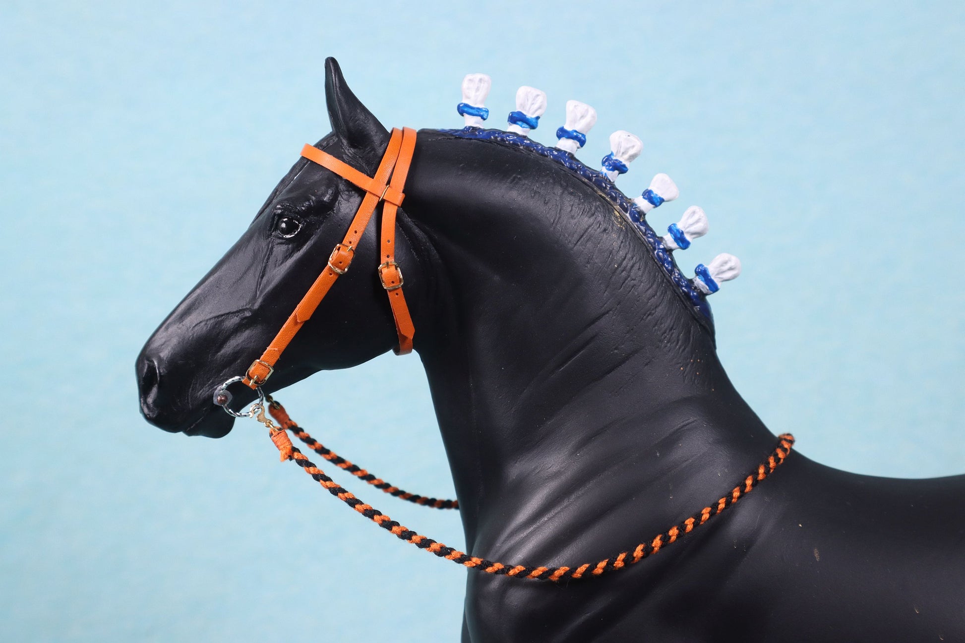 This is an orange leather snaffle bridle, made on the Stone Horses standing drafter mold. It is made from kangaroo leather lace. Features include working tongue buckles all around, and a snaffle bit that I made. The hardware on the headstall is gold in color.