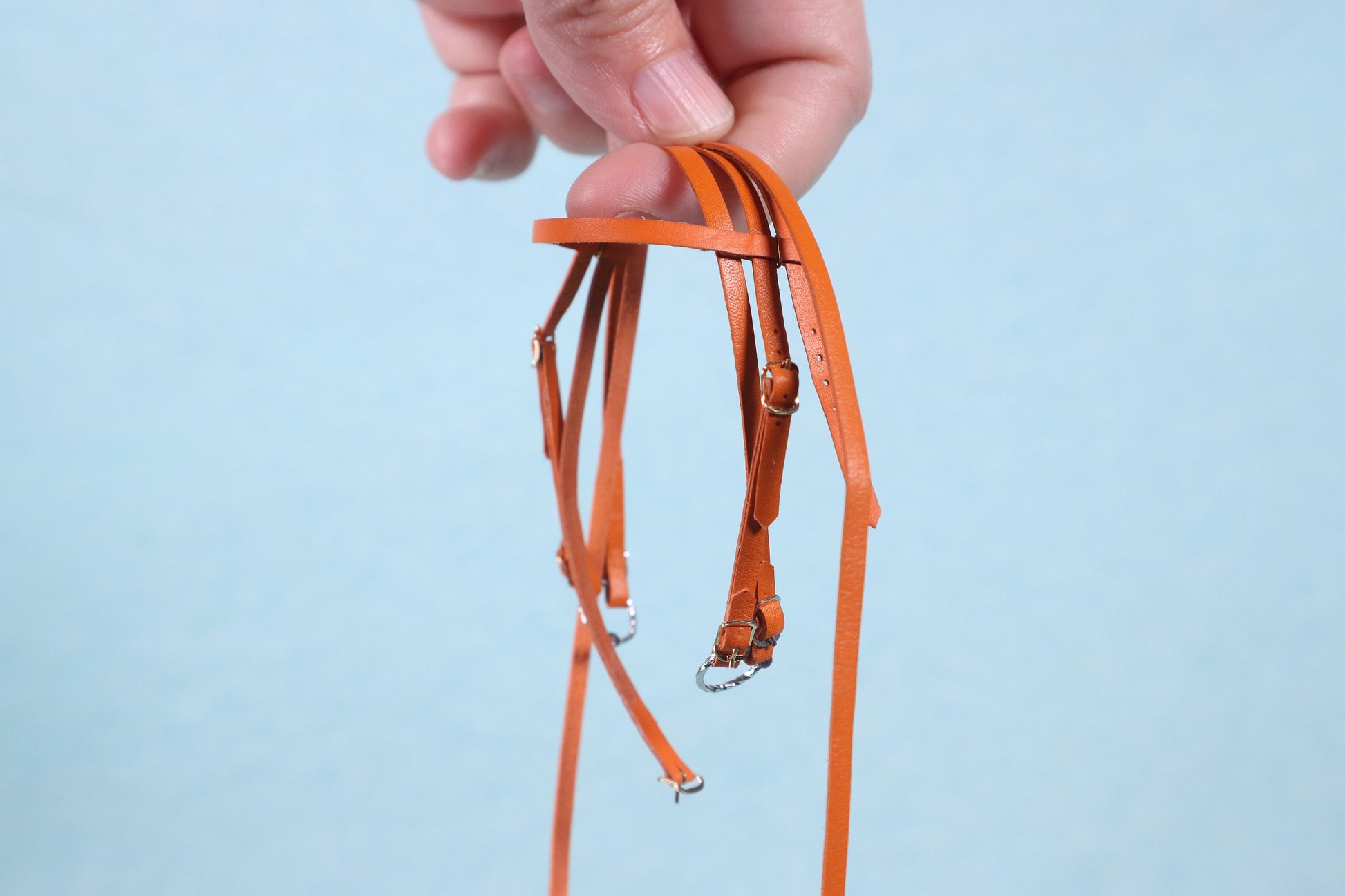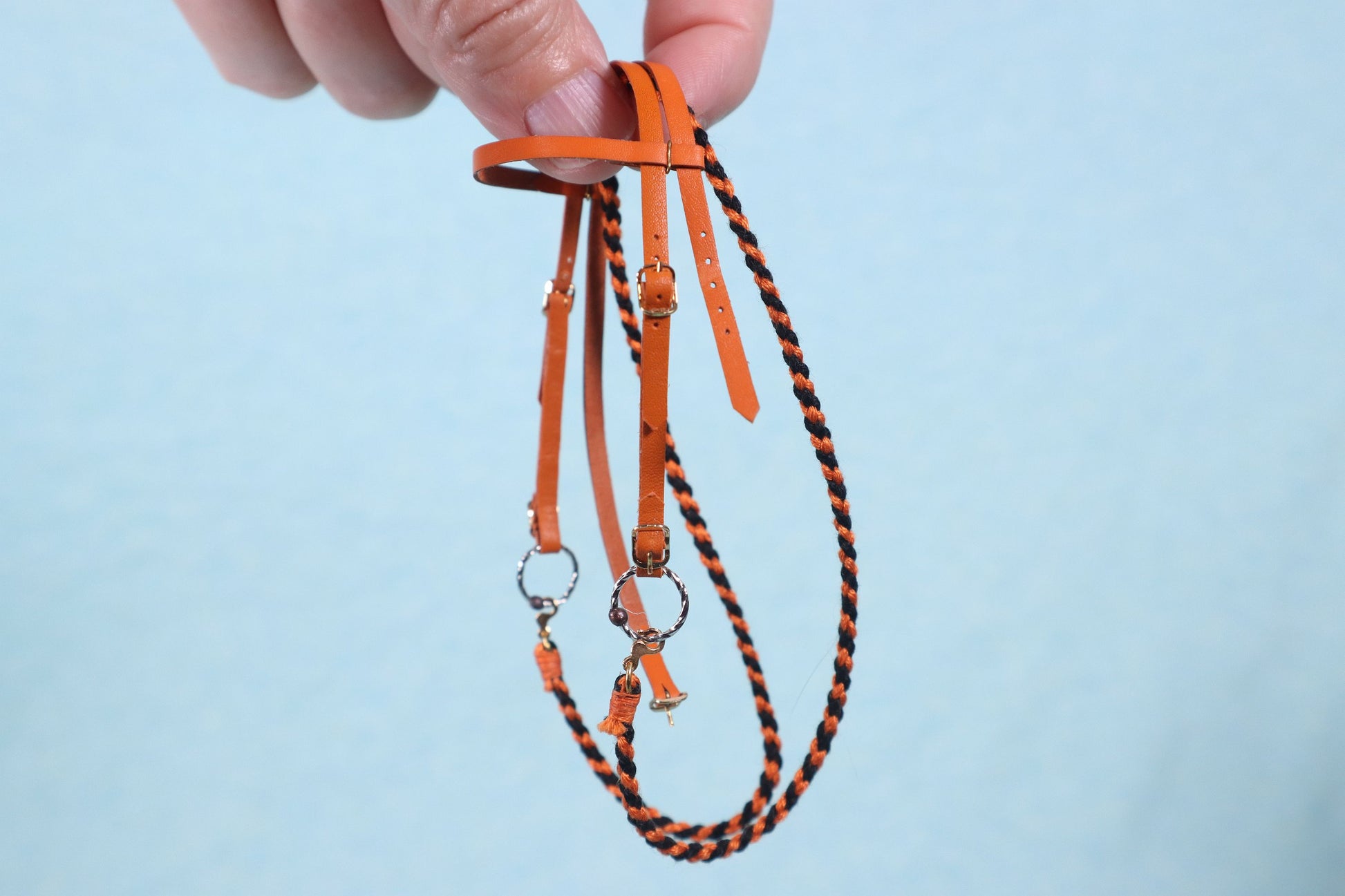 It comes with two sets of reins. One pair is matching leather, with buckle ends. The other is a one piece braided rope rein, orange and black, with snap ends.