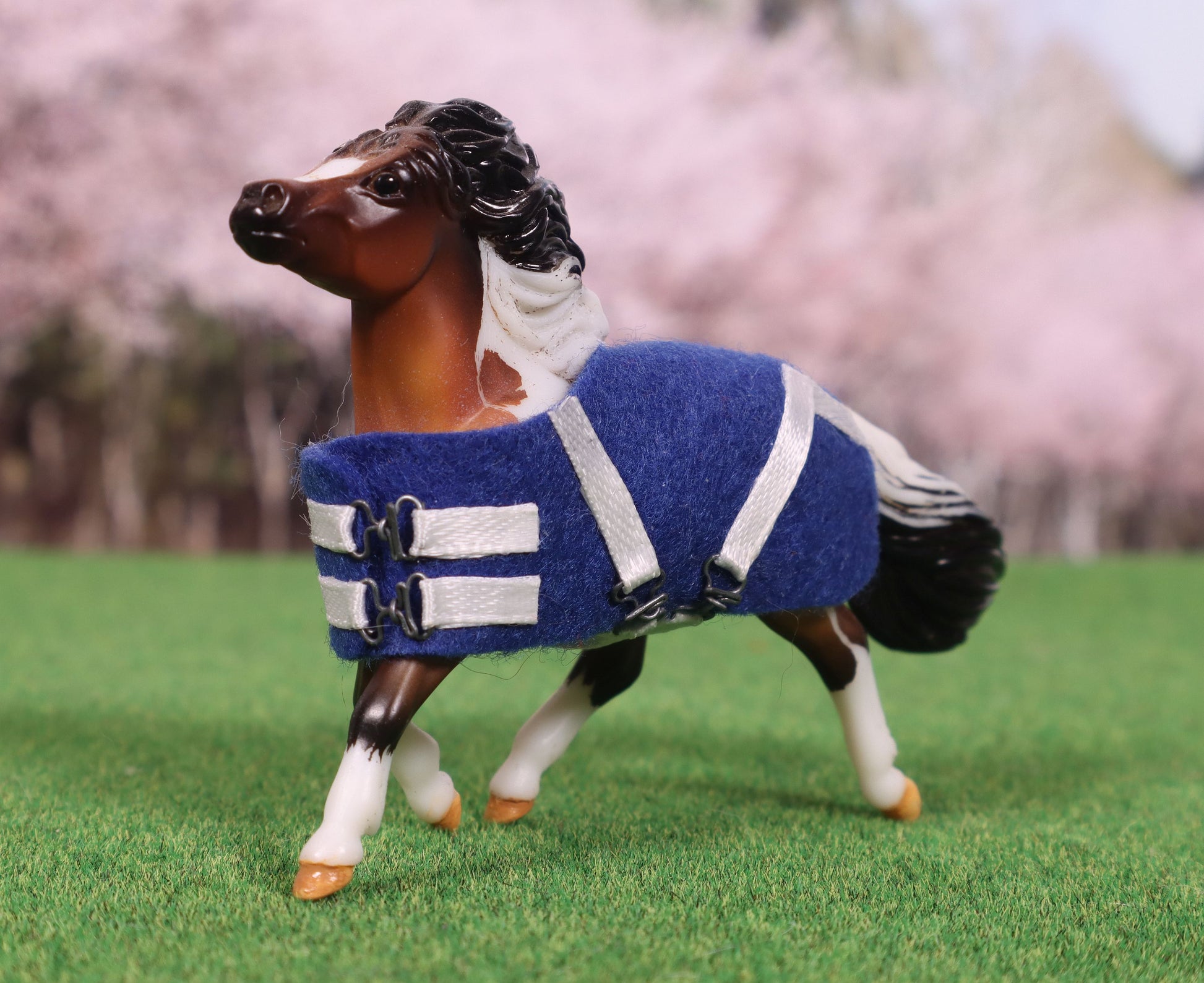 This is a blanket made for Stablemate (approximately 1:32) scale model horses. This blanket was made on the G2 Pony mold and is made of blue felt, with white straps, and working t-buckles on the chest and belly.