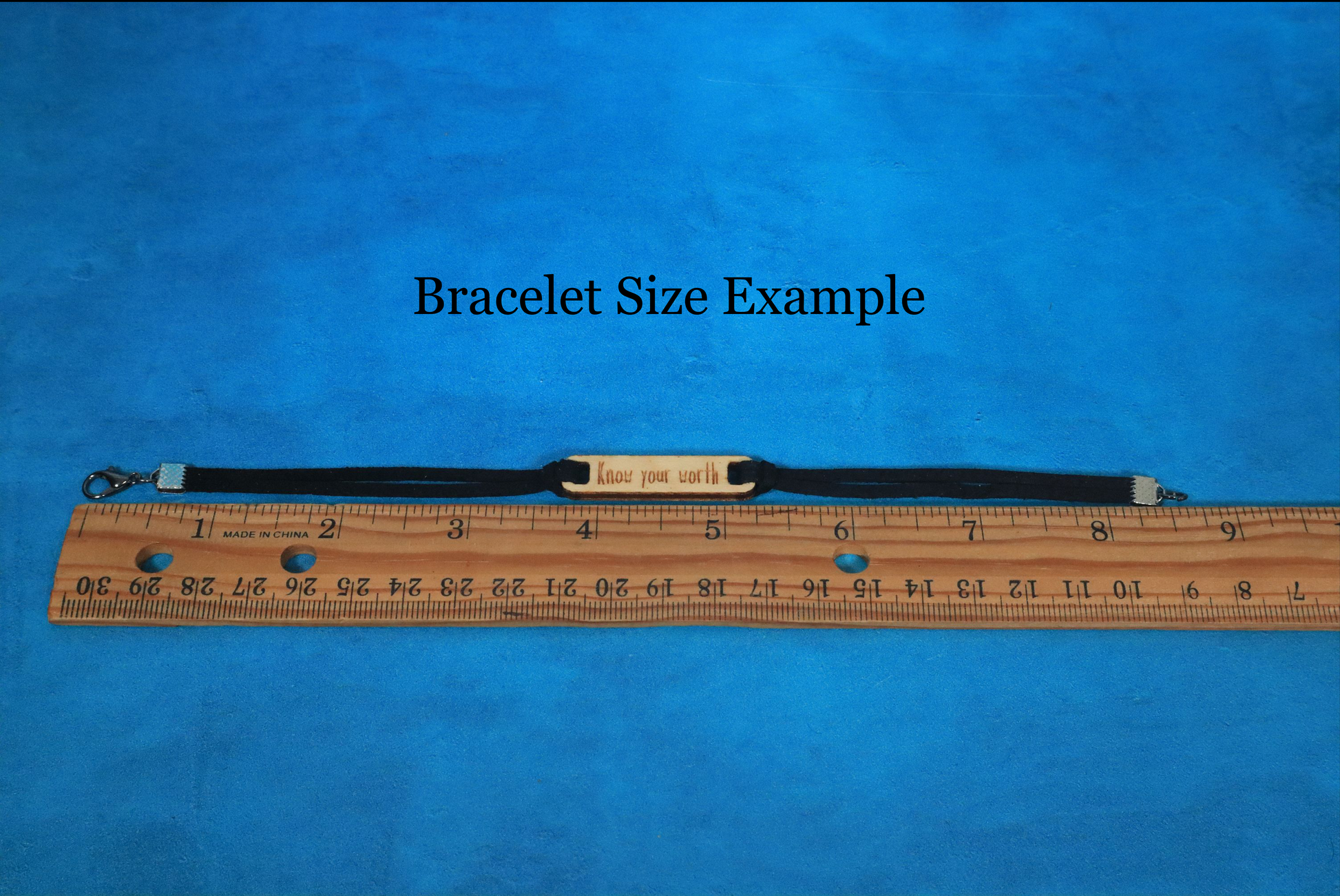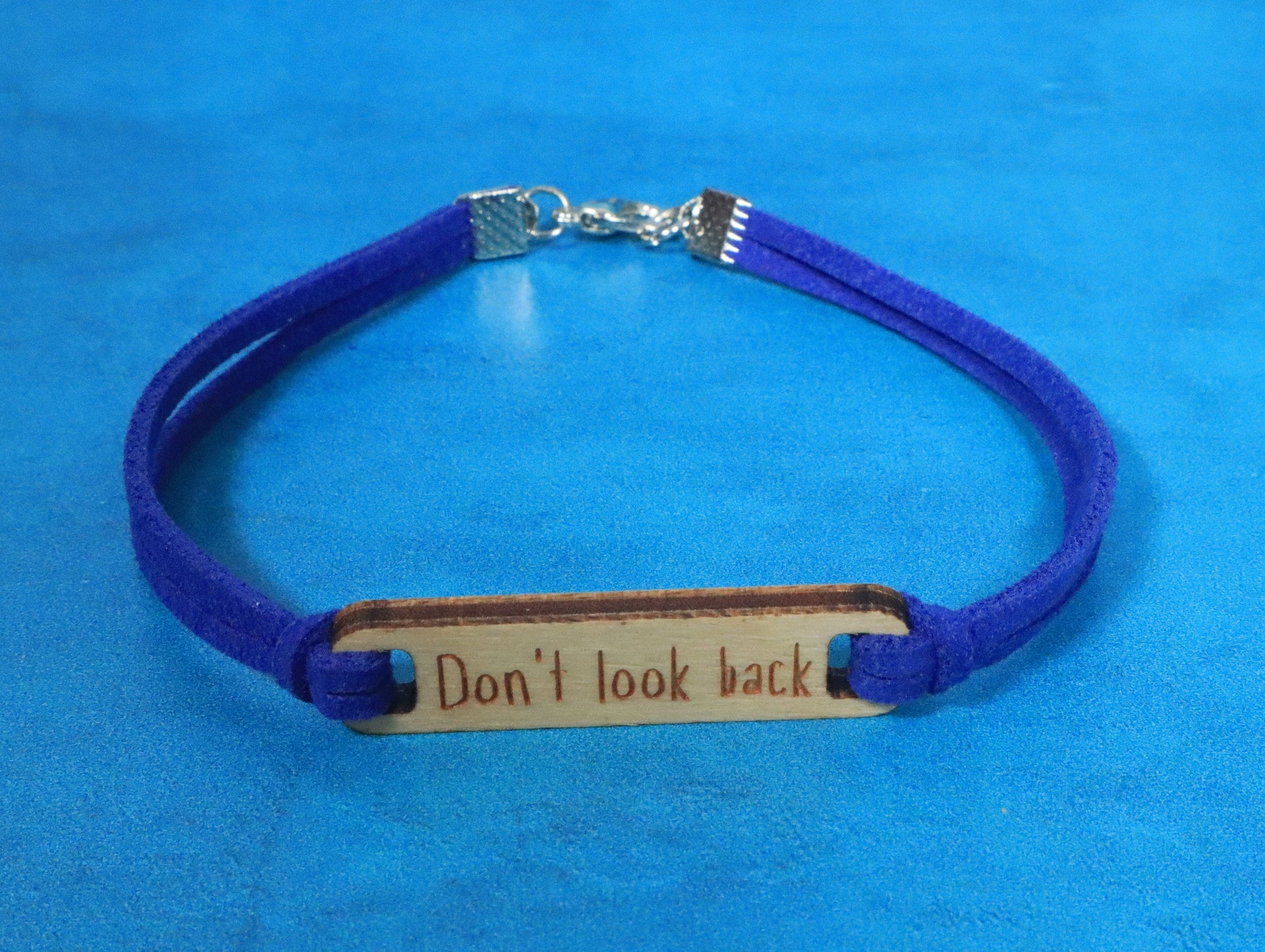 This blue and silver bracelet boasts laser cut and engraved detailing, along with a durable blue faux suede cord, and sleek silver colored hardware. Elevate any look with this elegant accessory that blends style and quality seamlessly and offers the reminder "Don't Look Back".