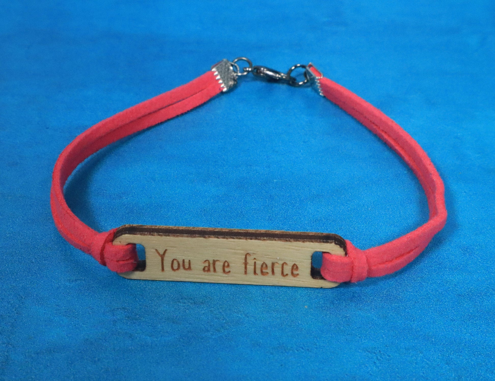 Stand out with this colorful bracelet. The laser cut and engraved birch wood charm adds a unique touch to the hot pink faux suede cord, completed with antique silver colored hardware. Show off your fierceness and turn heads with this fun accessory.
