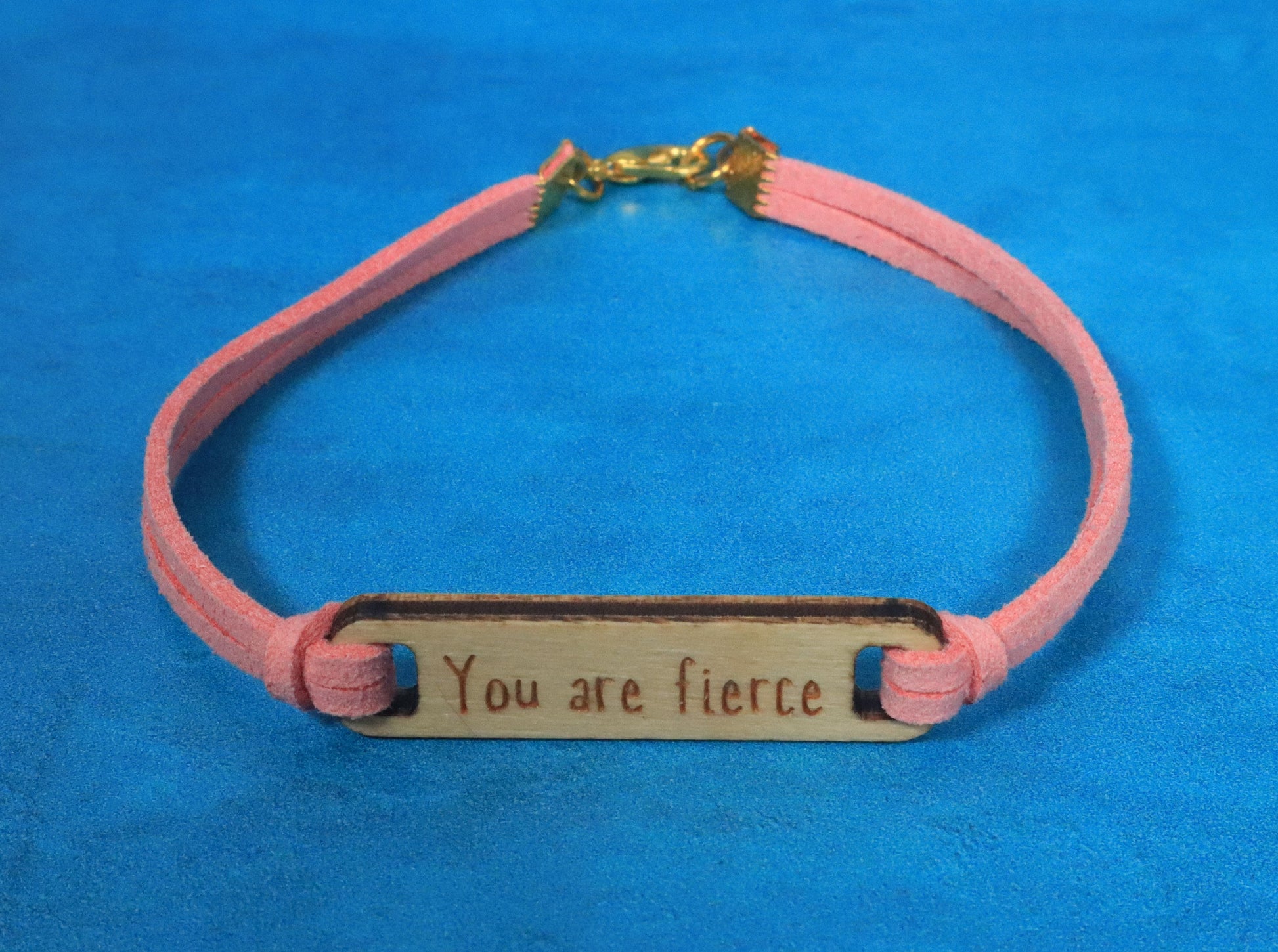 This laser cut and engraved birch wood charm bracelet, accented with a light pink faux suede cord, and gold colored hardware, is a fierce addition to any outfit. Its delicate design and bold message make it a must-have for anyone looking to make a statement. Show the world your strength and confidence with this elegant piece.