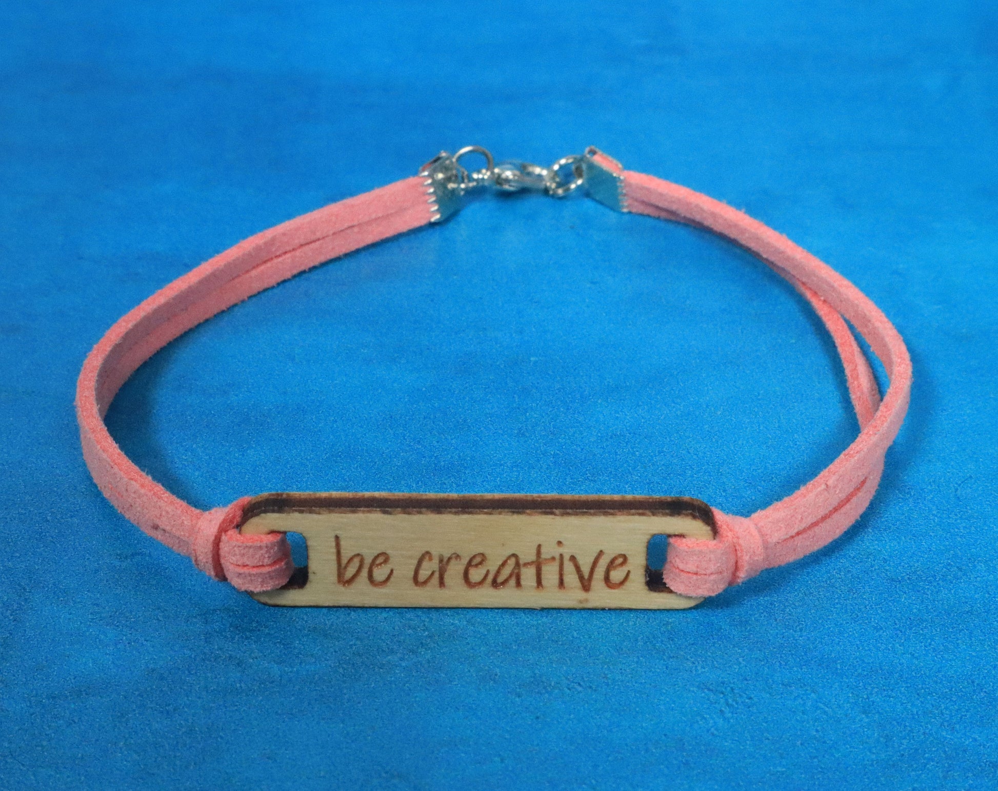 Enhance your style. With a laser cut and engraved birch wood charm and a light pink faux suede cord, this bracelet exudes elegance. Finished with silver colored hardware, it's the perfect accessory for any outfit while reminding you to Be Creative. Elevate your look today!