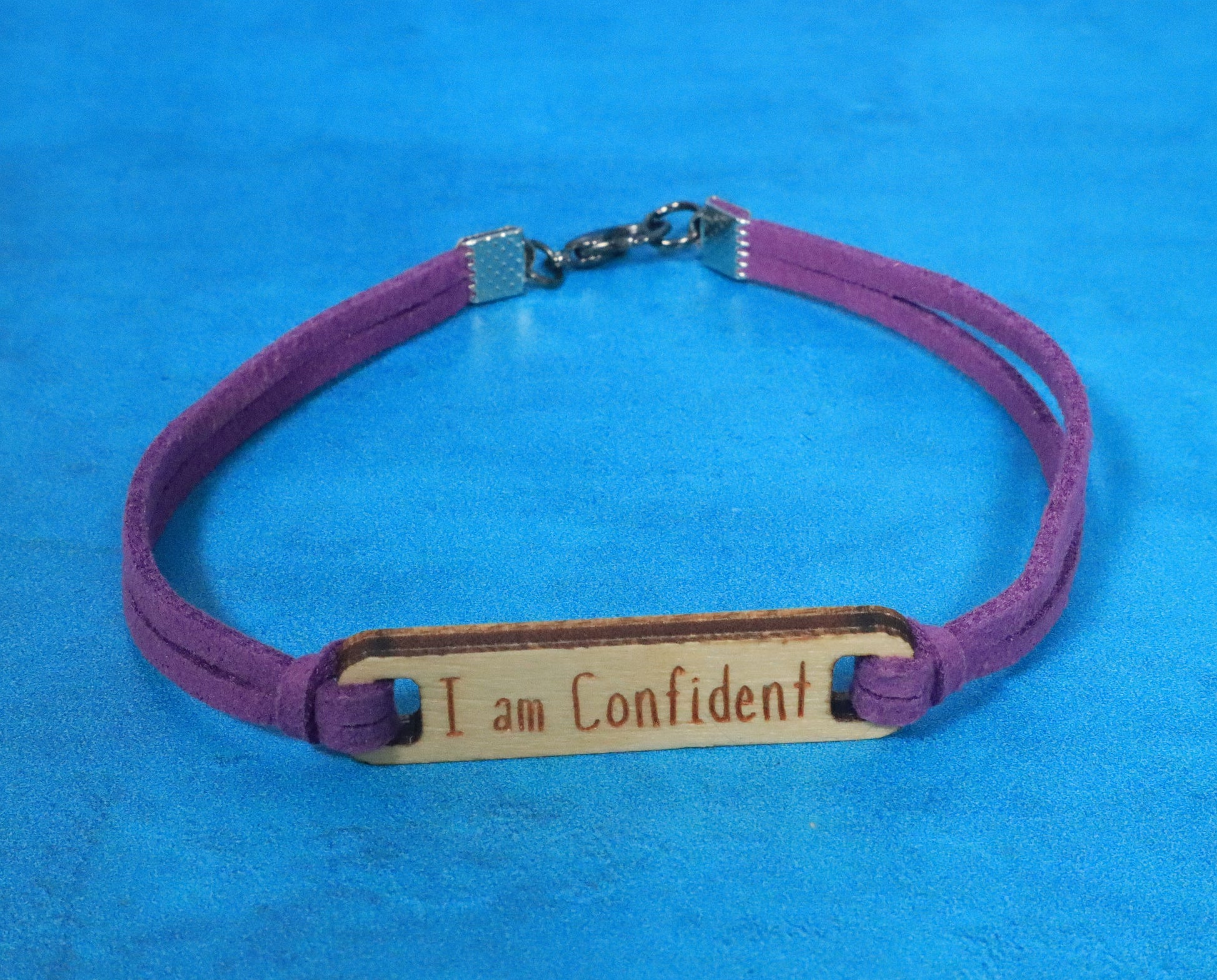 Unleash your confidence with this fun bracelet. The laser cut and engraved birch wood charm symbolizes strength, while the purple faux suede cord adds a touch of elegance. Finished with antique silver colored hardware for a sleek, polished look.