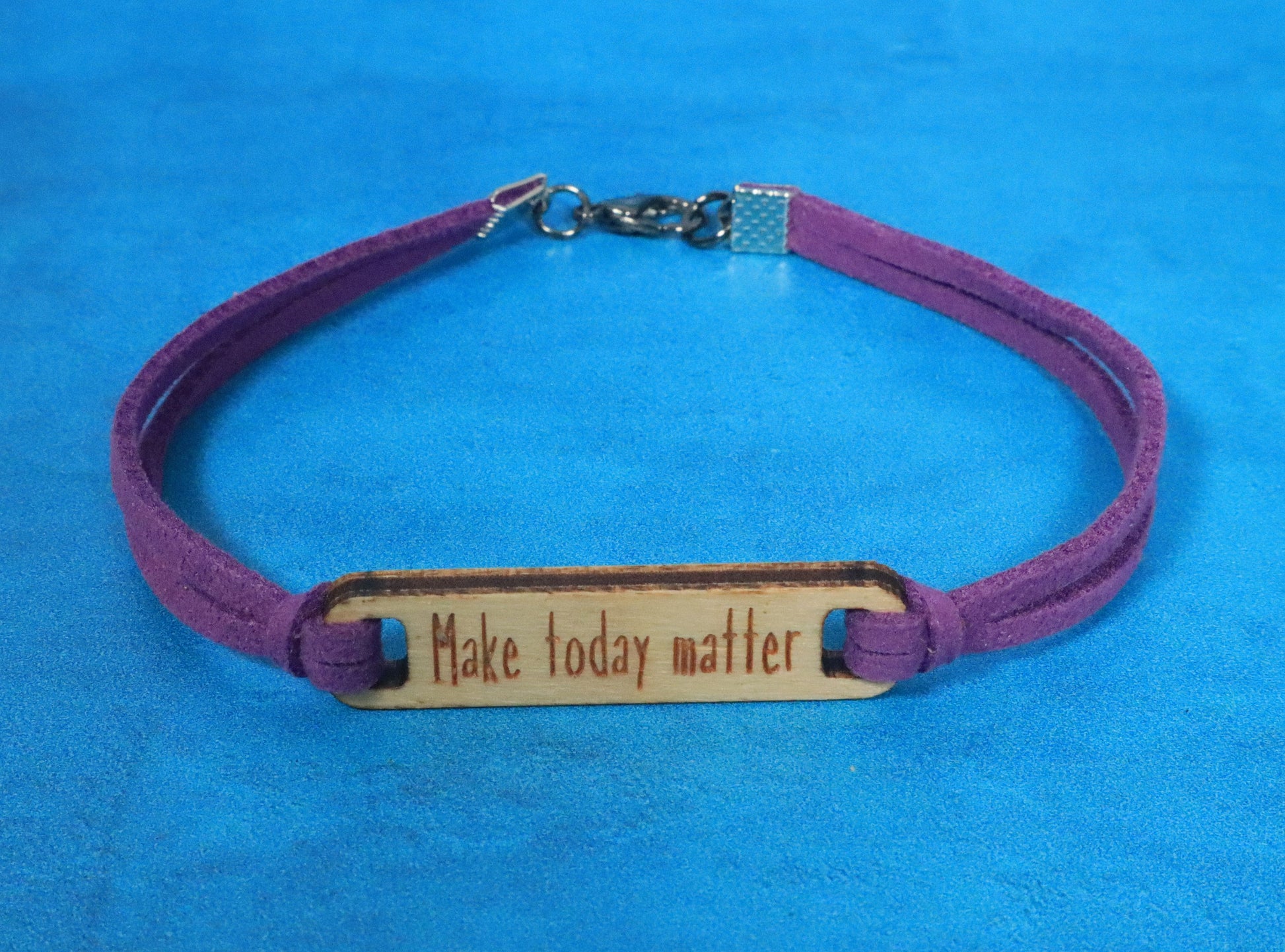 Elevate your style and mindset with this that reminds you to "Make Today Matter". Featuring a laser cut and engraved birch wood charm, this bracelet exudes class and sophistication. The purple faux suede cord adds a pop of color, while the antique silver colored hardware ties the design together.