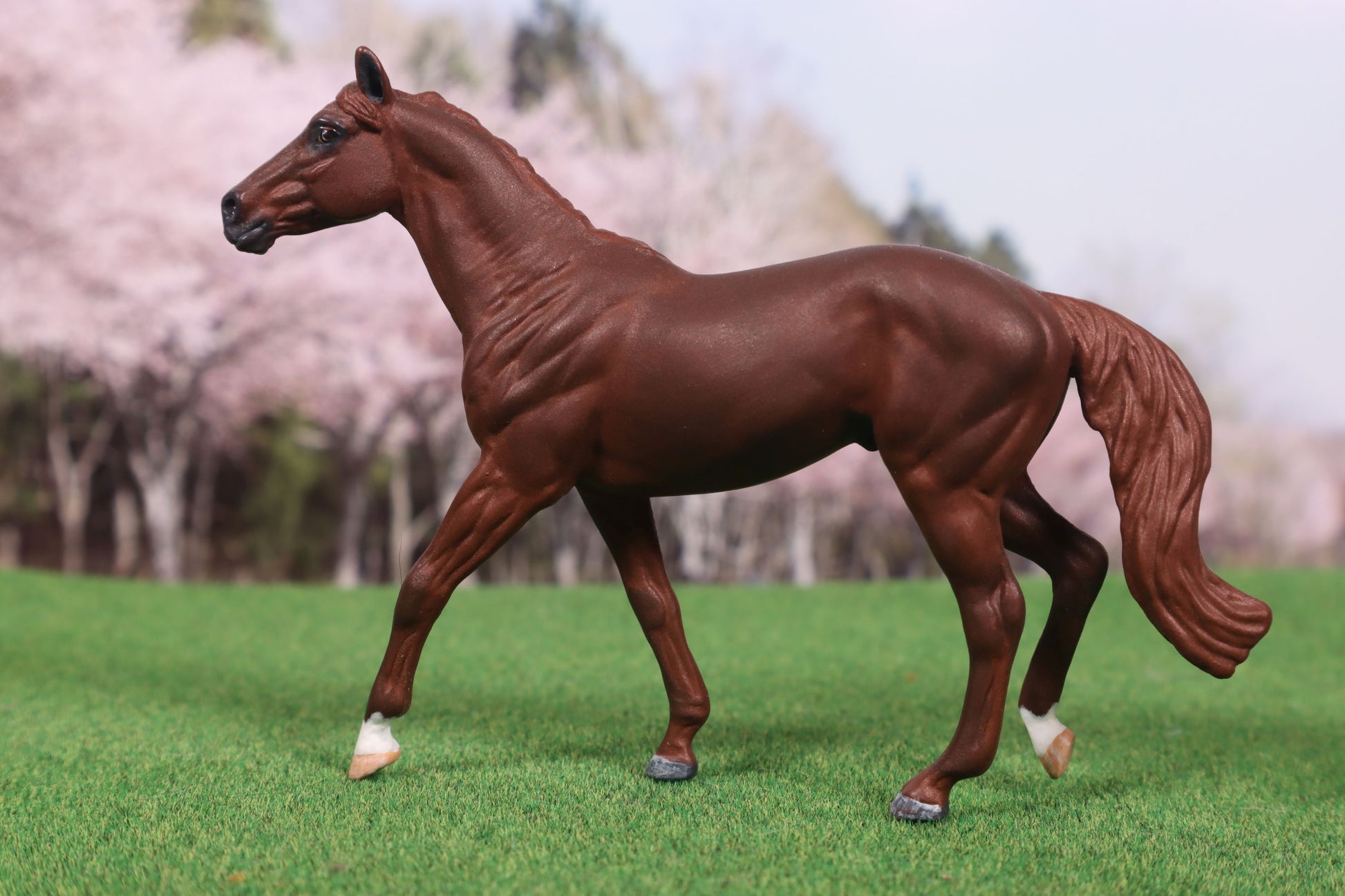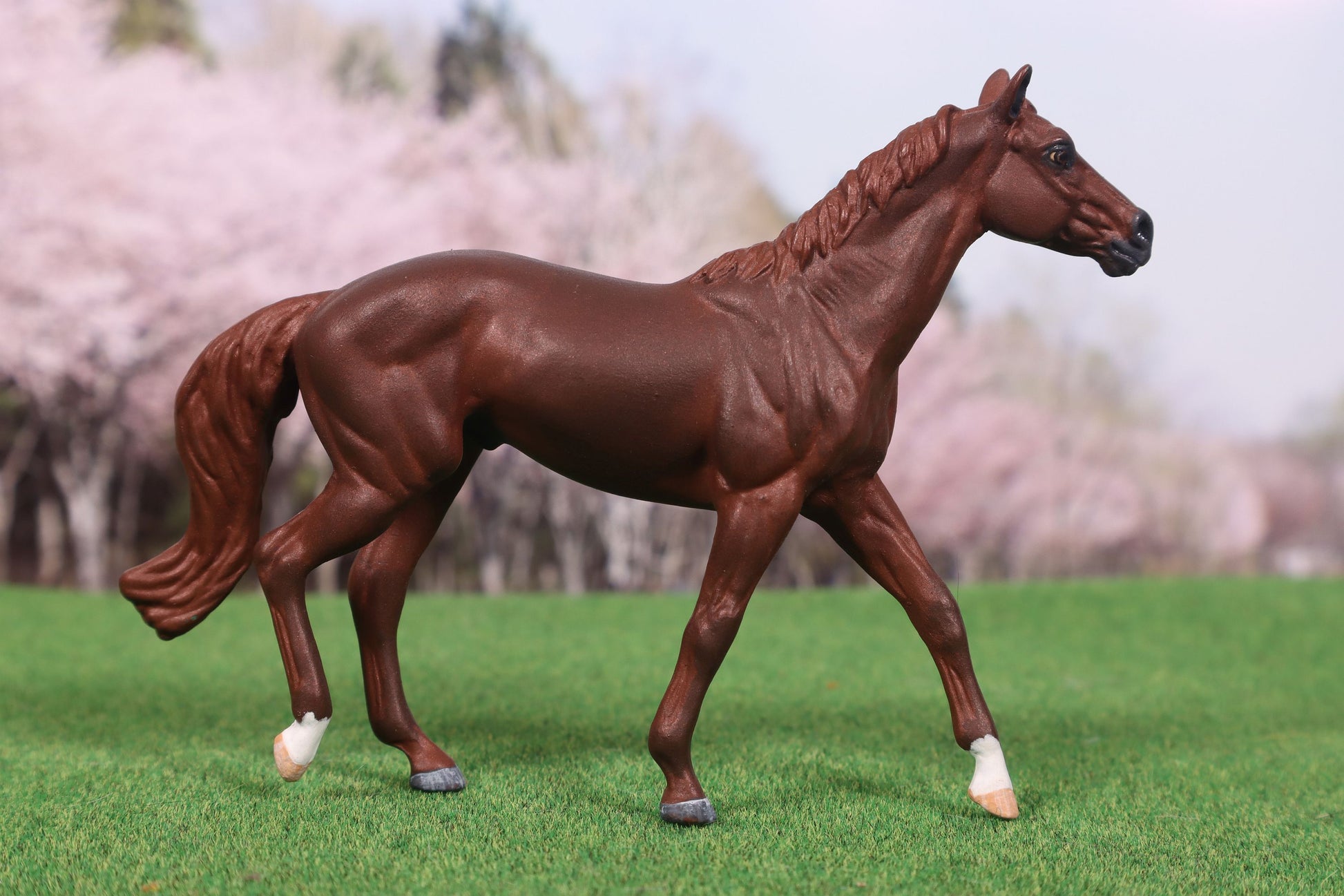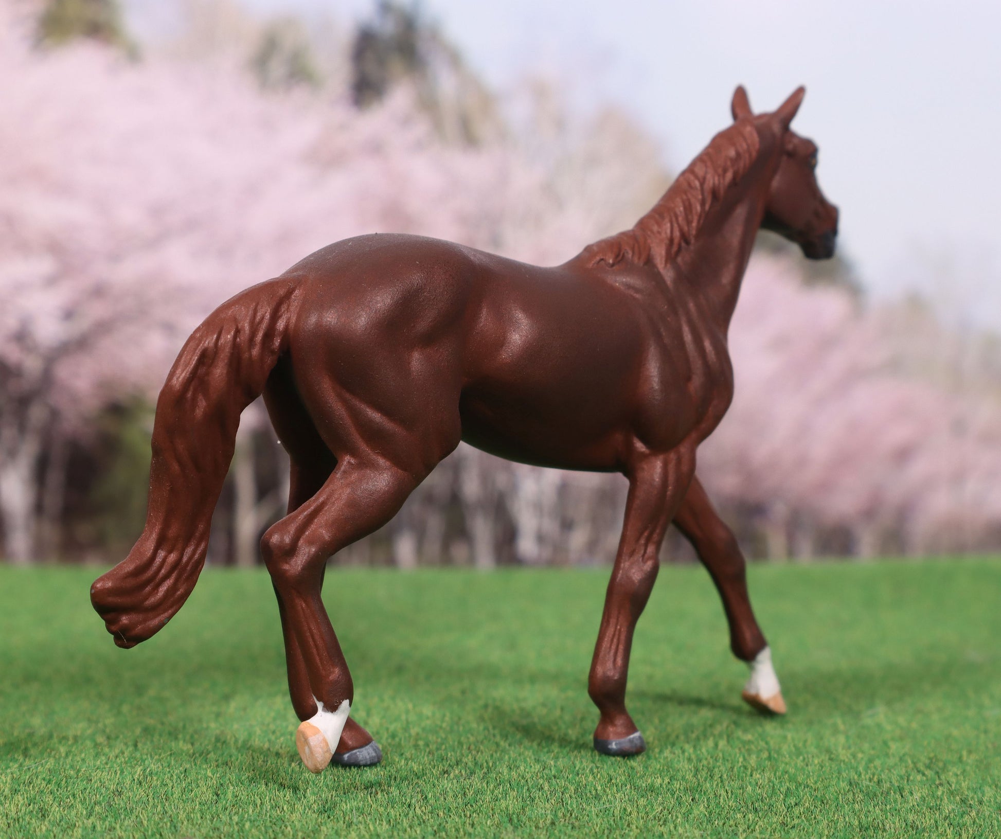 This model started as the Breyer Stablemate Walking Thoroughbred. I prepped and painted him to a liver chestnut in 2020. He has a front and rear sock for markings. Detailing includes eyes, hooves, and skin. He was then sprayed with a sealer.