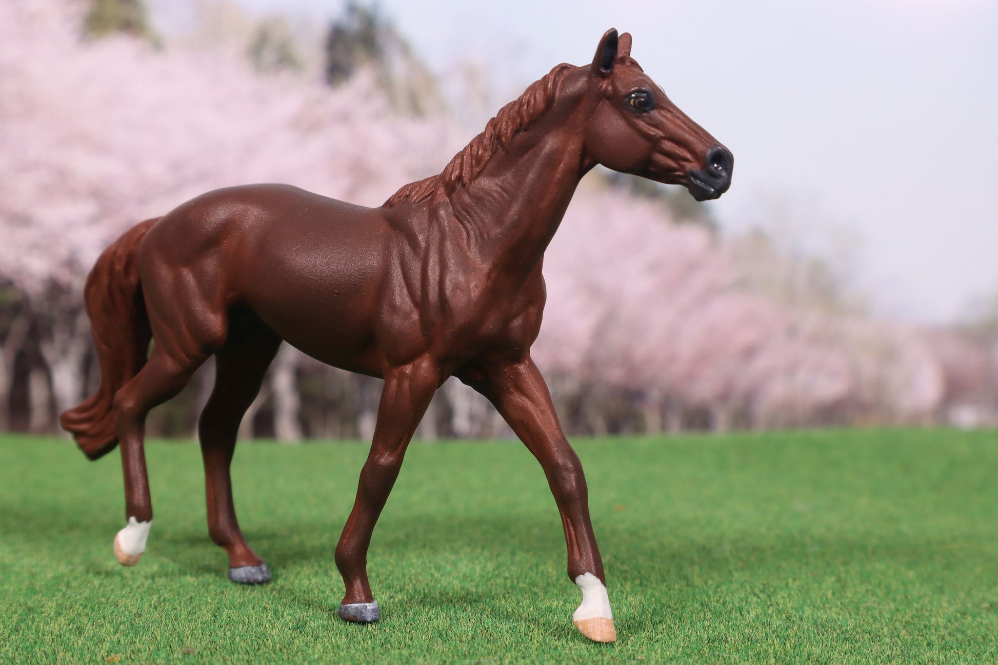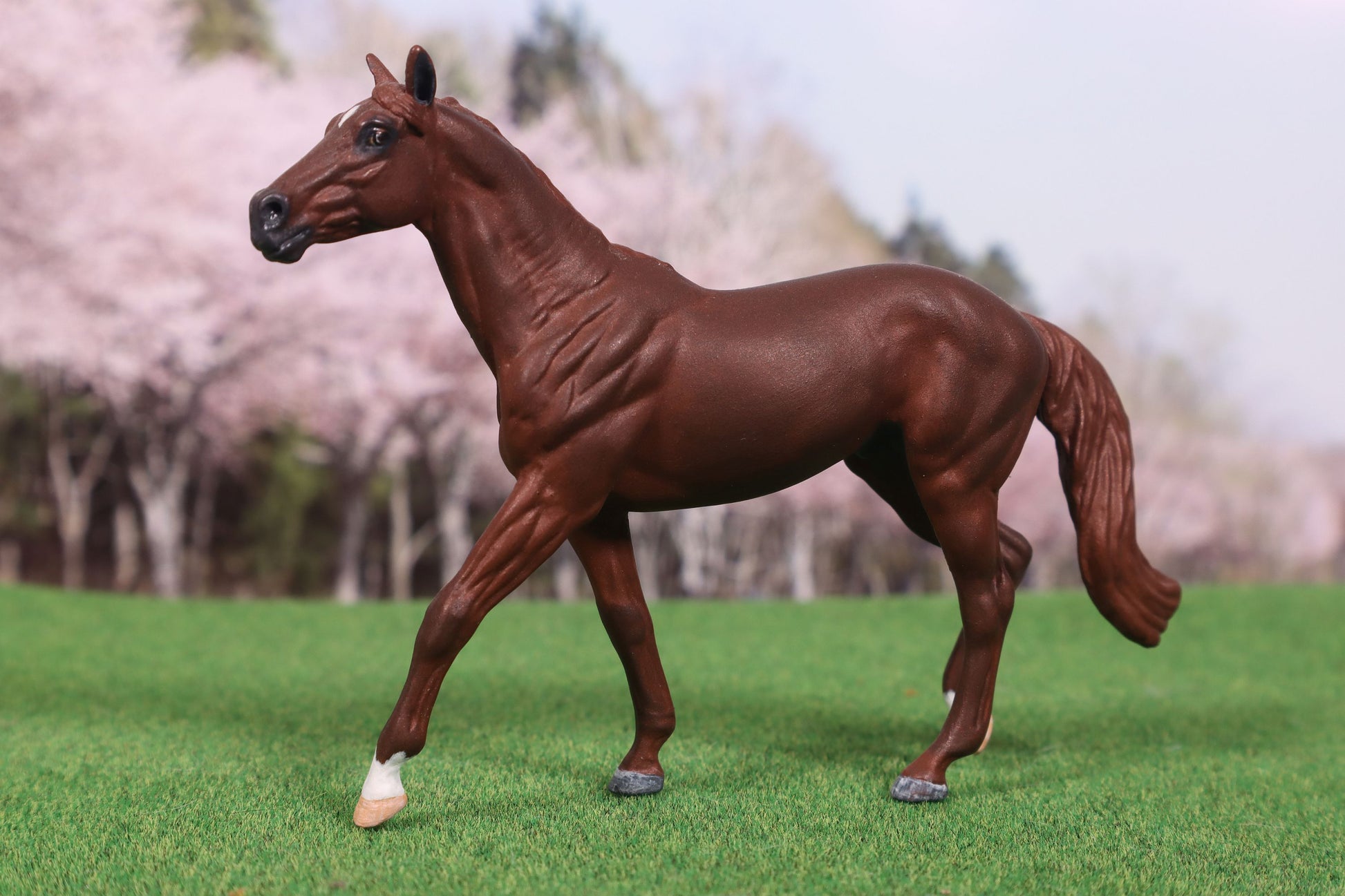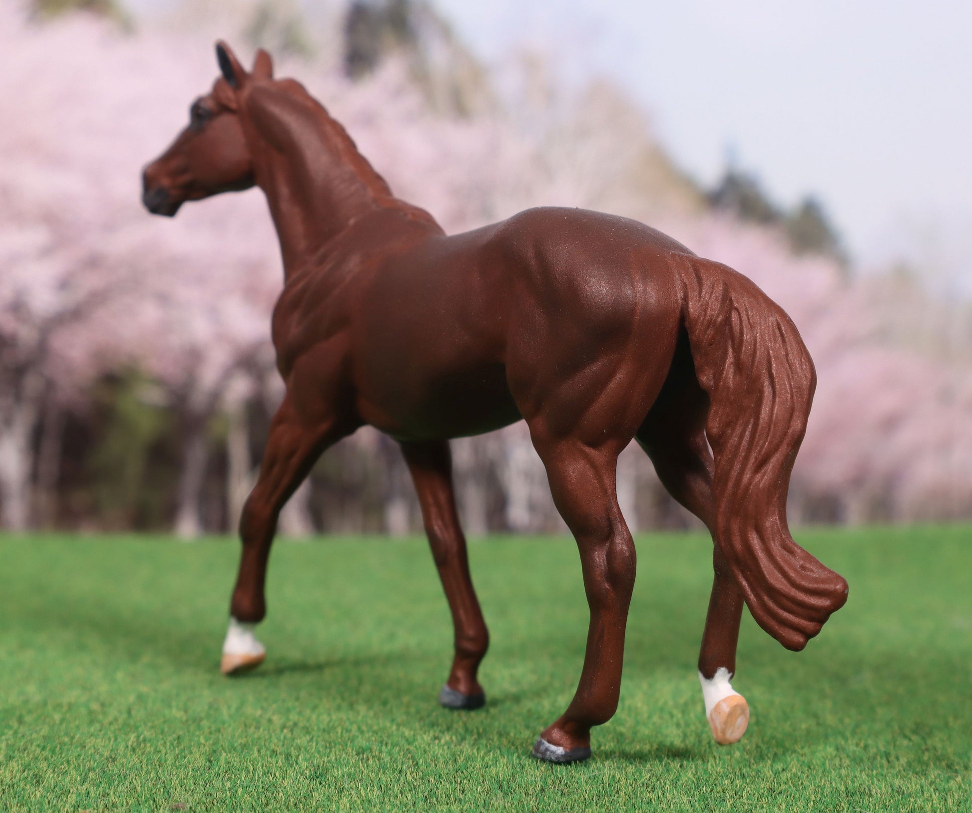 This model started as the Breyer Stablemate Walking Thoroughbred. I prepped and painted him to a liver chestnut in 2020. He has a front and rear sock for markings. Detailing includes eyes, hooves, and skin. He was then sprayed with a sealer.