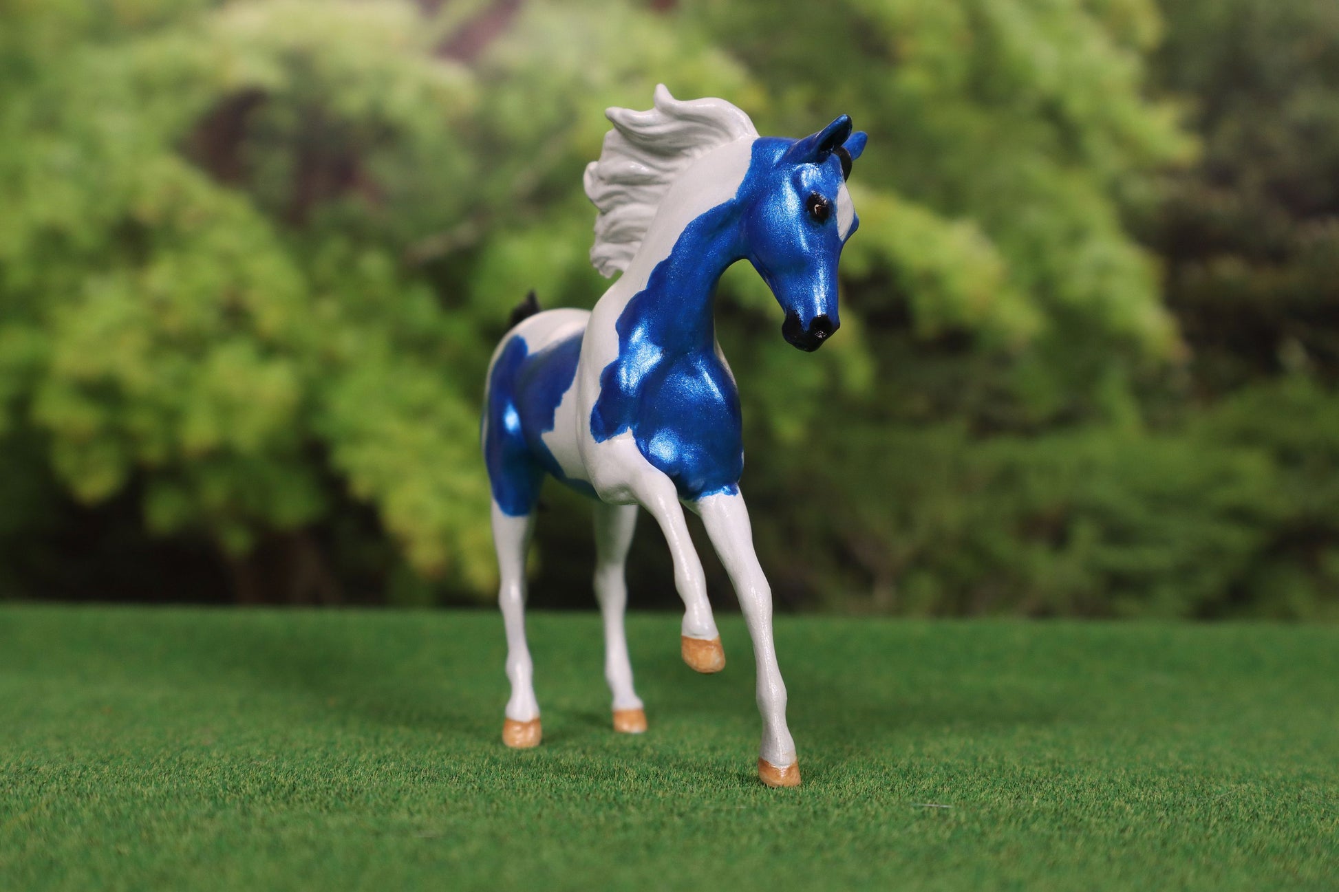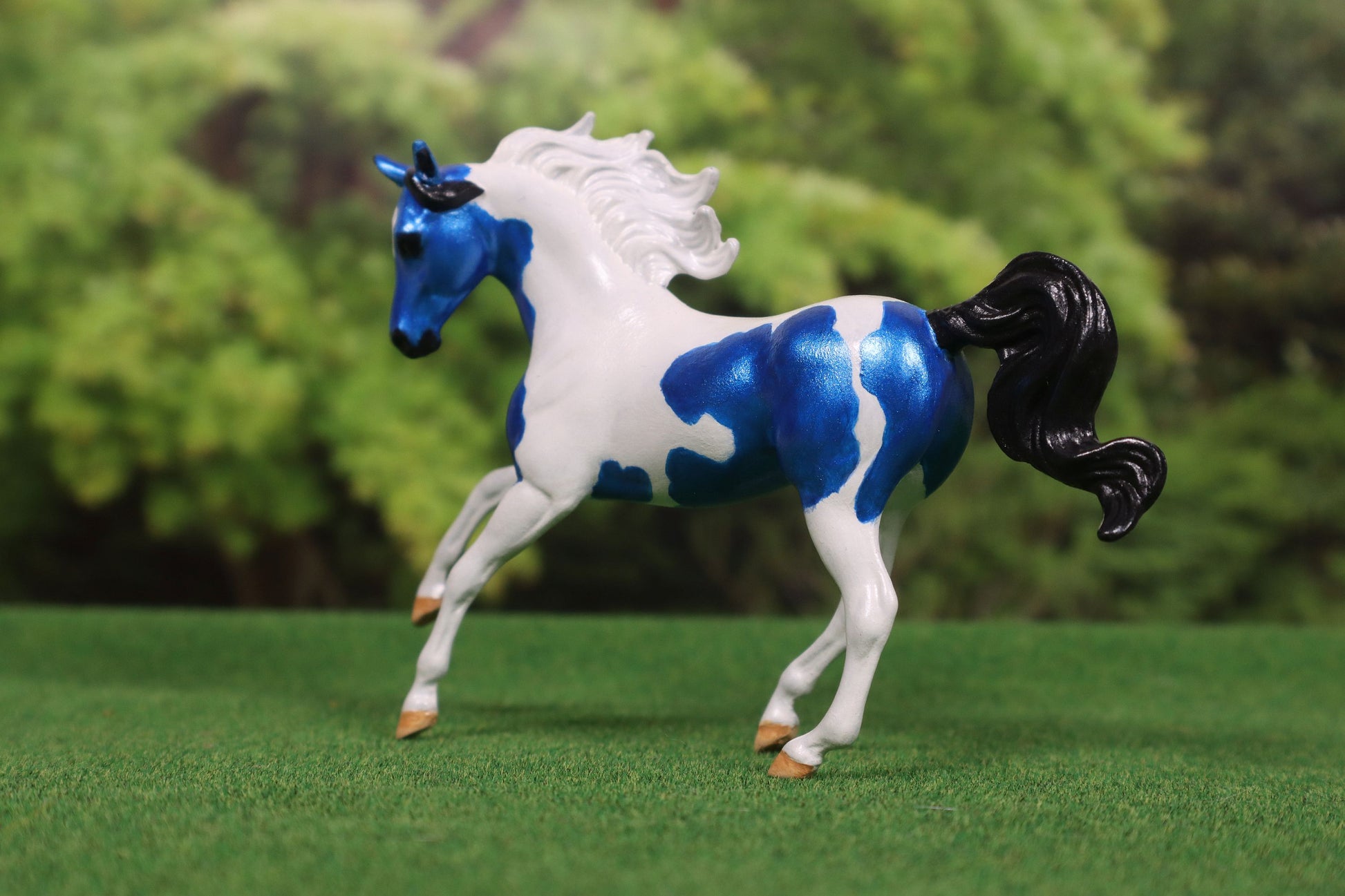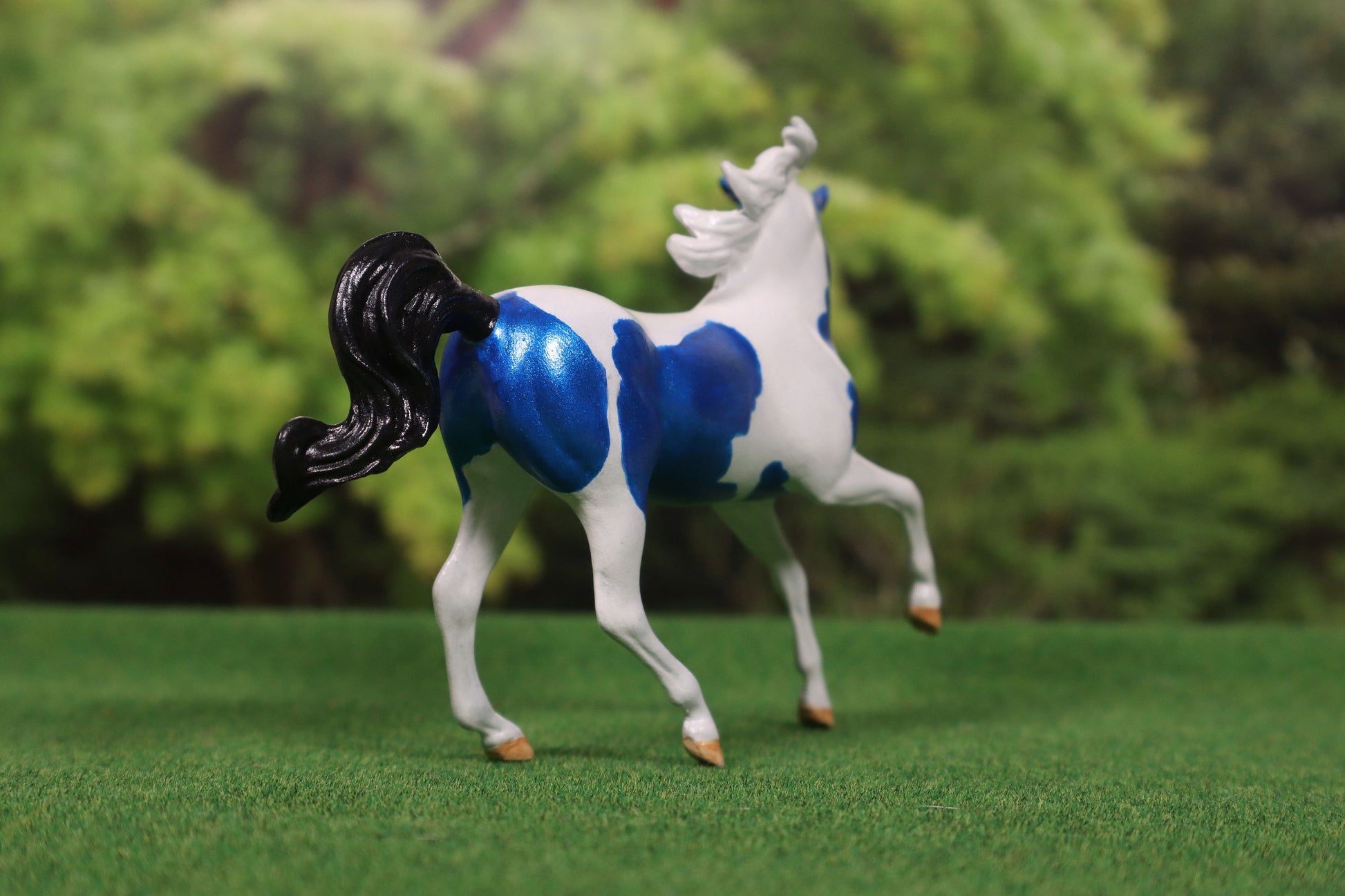 This eye-catching, spirited little mare is the Breyer Mini Magnolia stablemate mold, repainted in acrylics to flashy metallic blue bay tobiano. Her detailing includes a shaded face, detailed eyes, and shell colored hooves. Her finish has been protected with a glossy top coat.