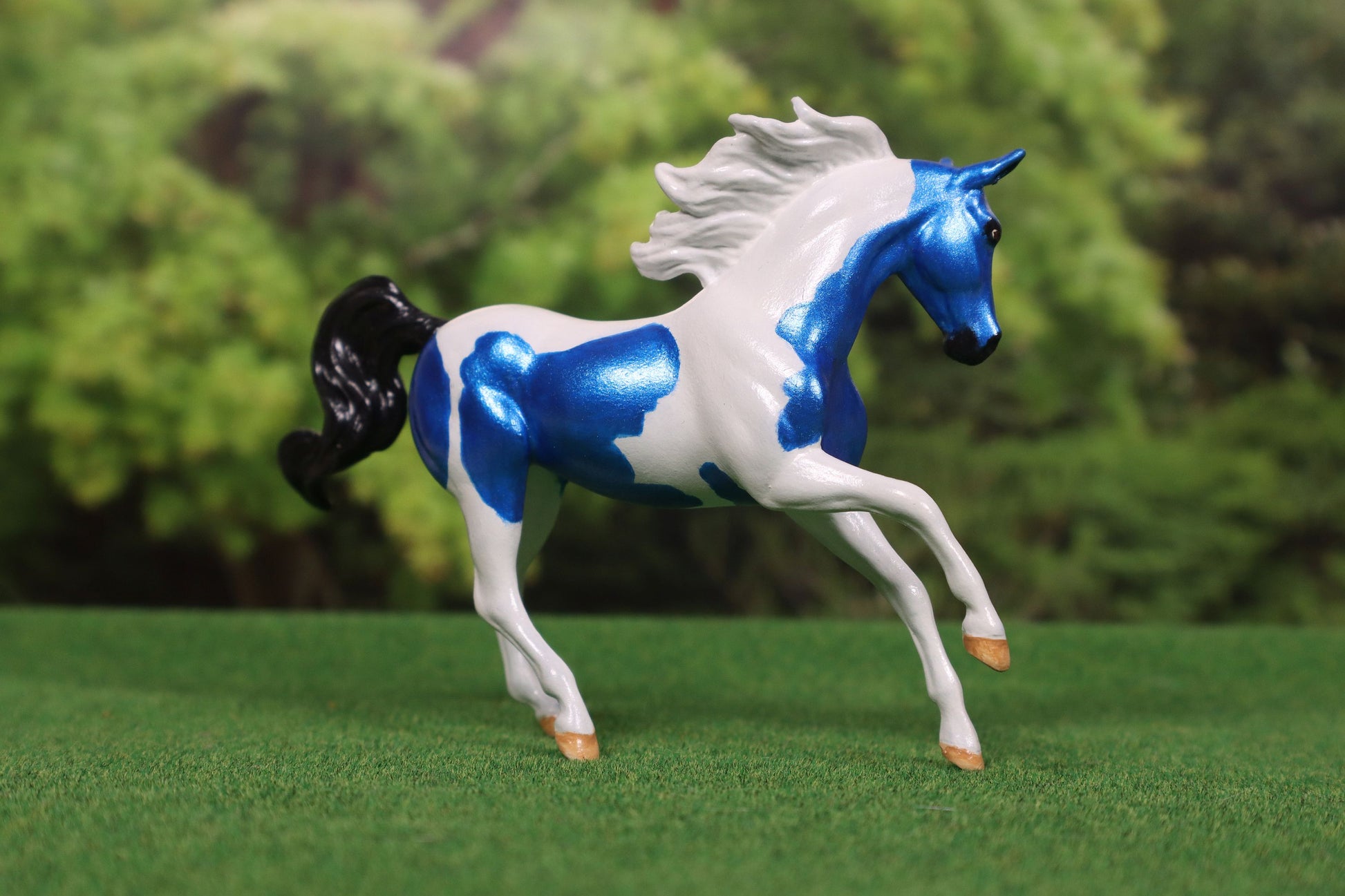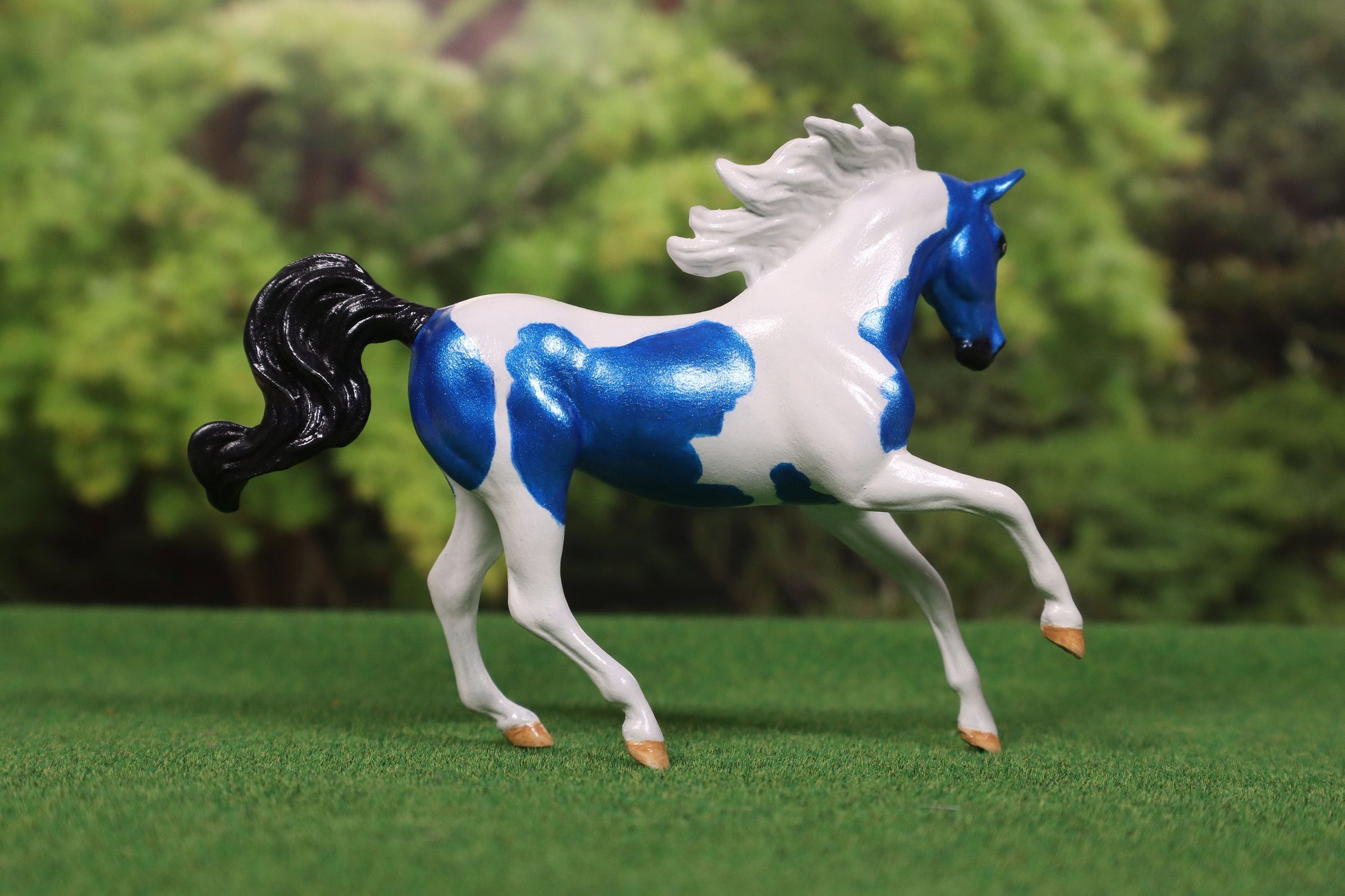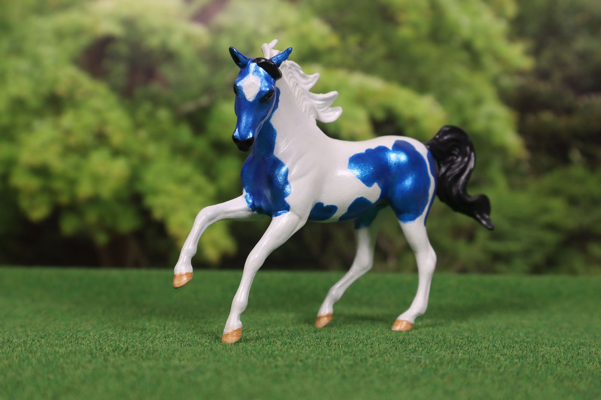 This eye-catching, spirited little mare is the Breyer Mini Magnolia stablemate mold, repainted in acrylics to flashy metallic blue bay tobiano. Her detailing includes a shaded face, detailed eyes, and shell colored hooves. Her finish has been protected with a glossy top coat.
