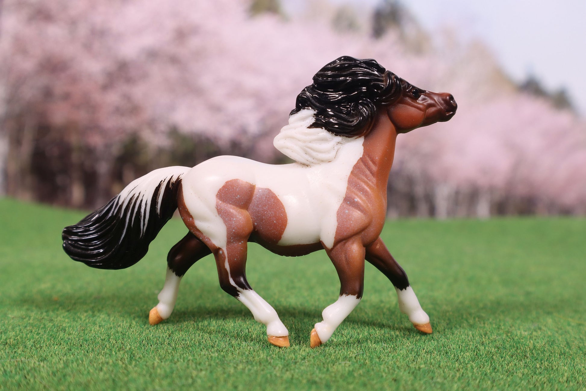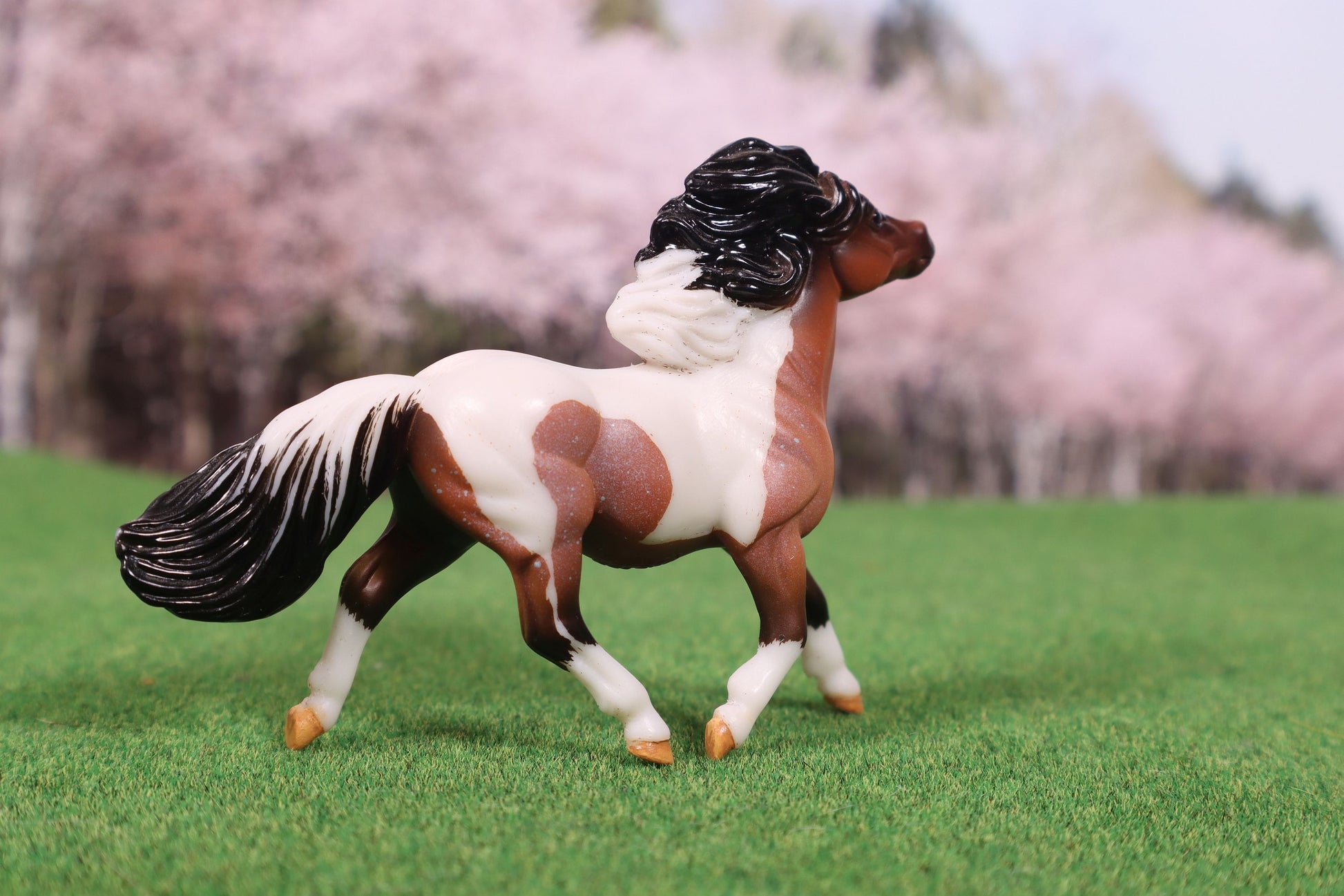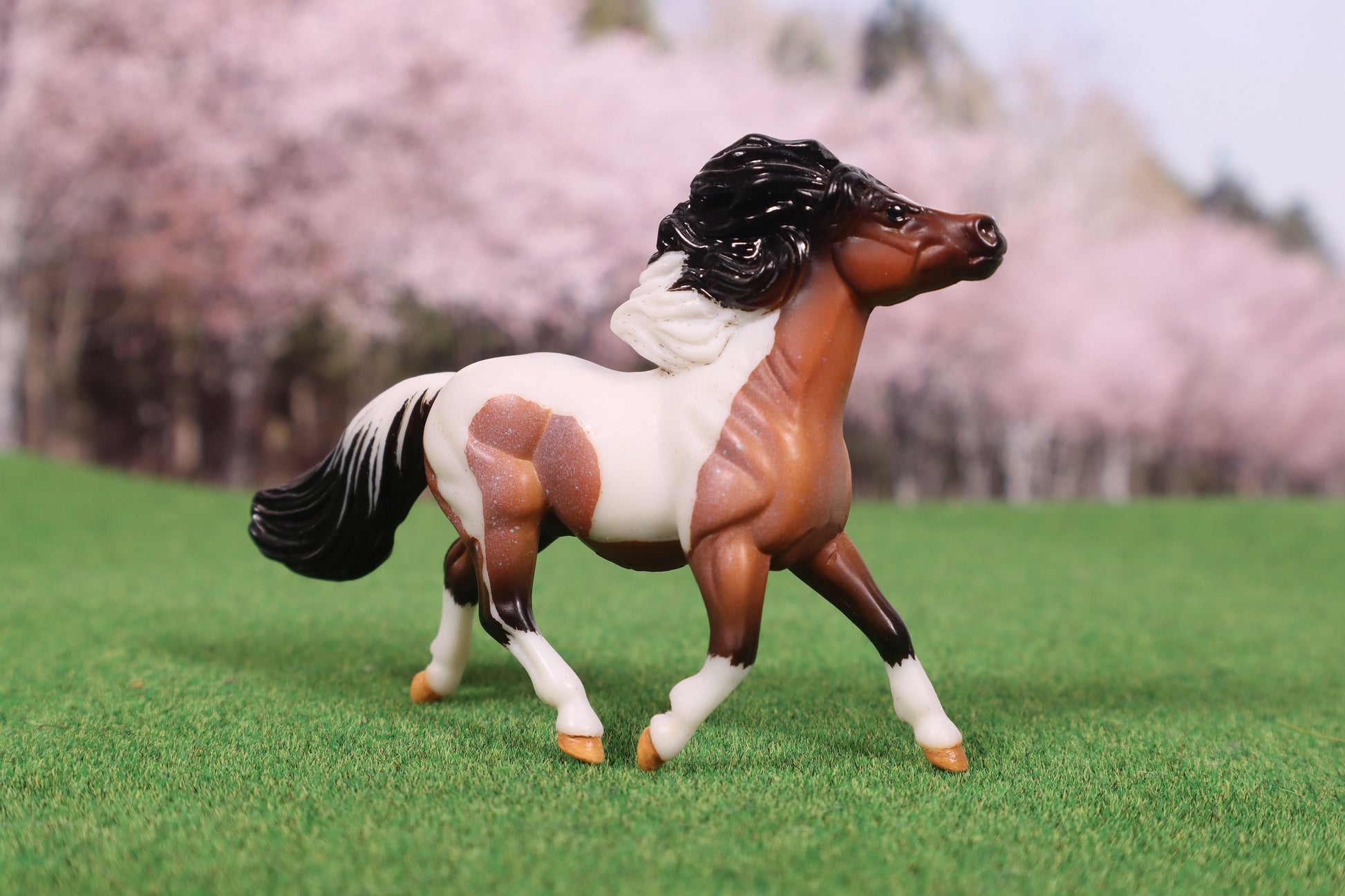 This model started as the Breyer Stablemate G2 Pony in bay roan. I etched him to a tobiano pinto pattern. I then added paint to detail his hooves. He was sprayed with a sealer to protect the painted detailing.