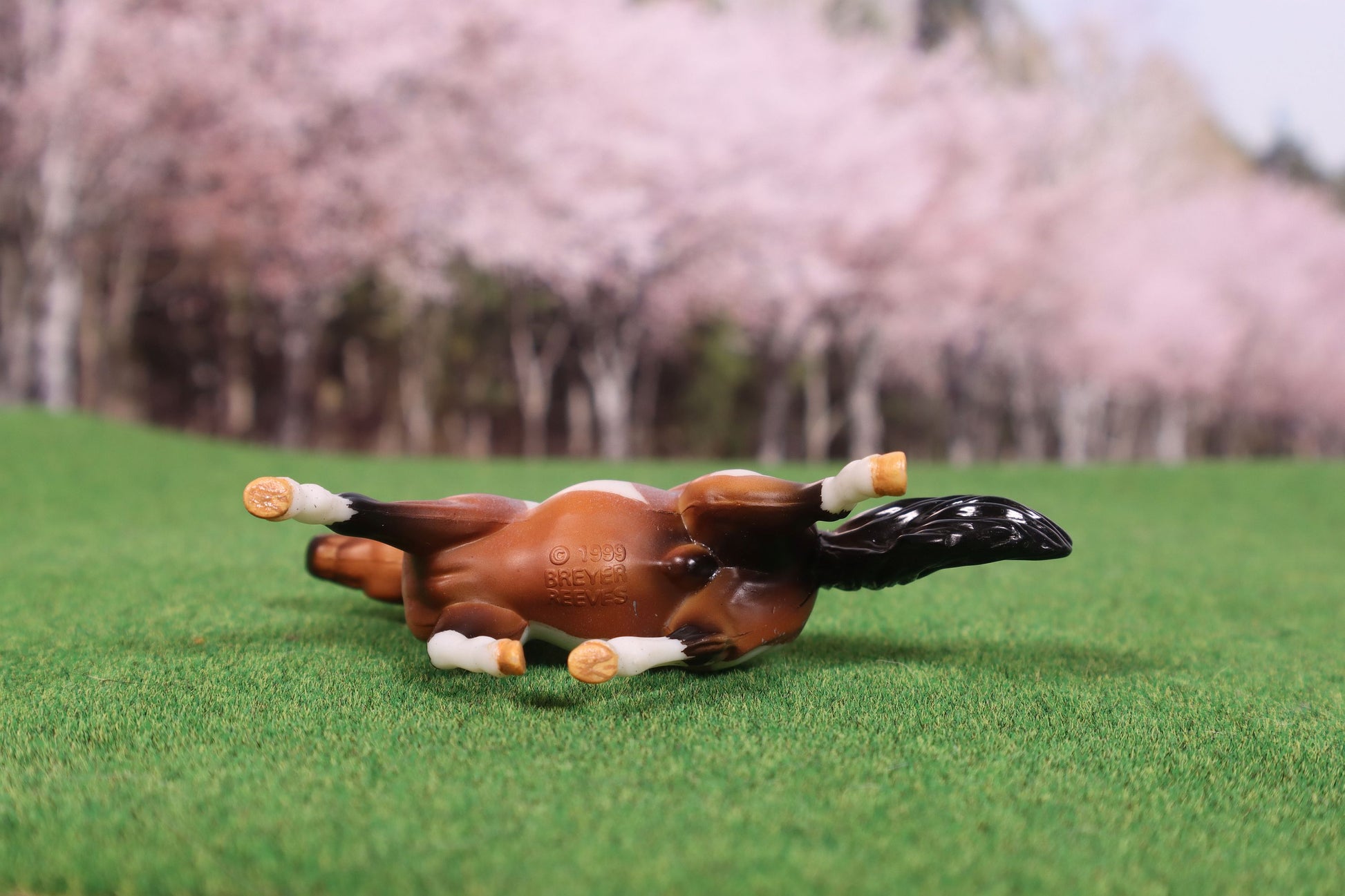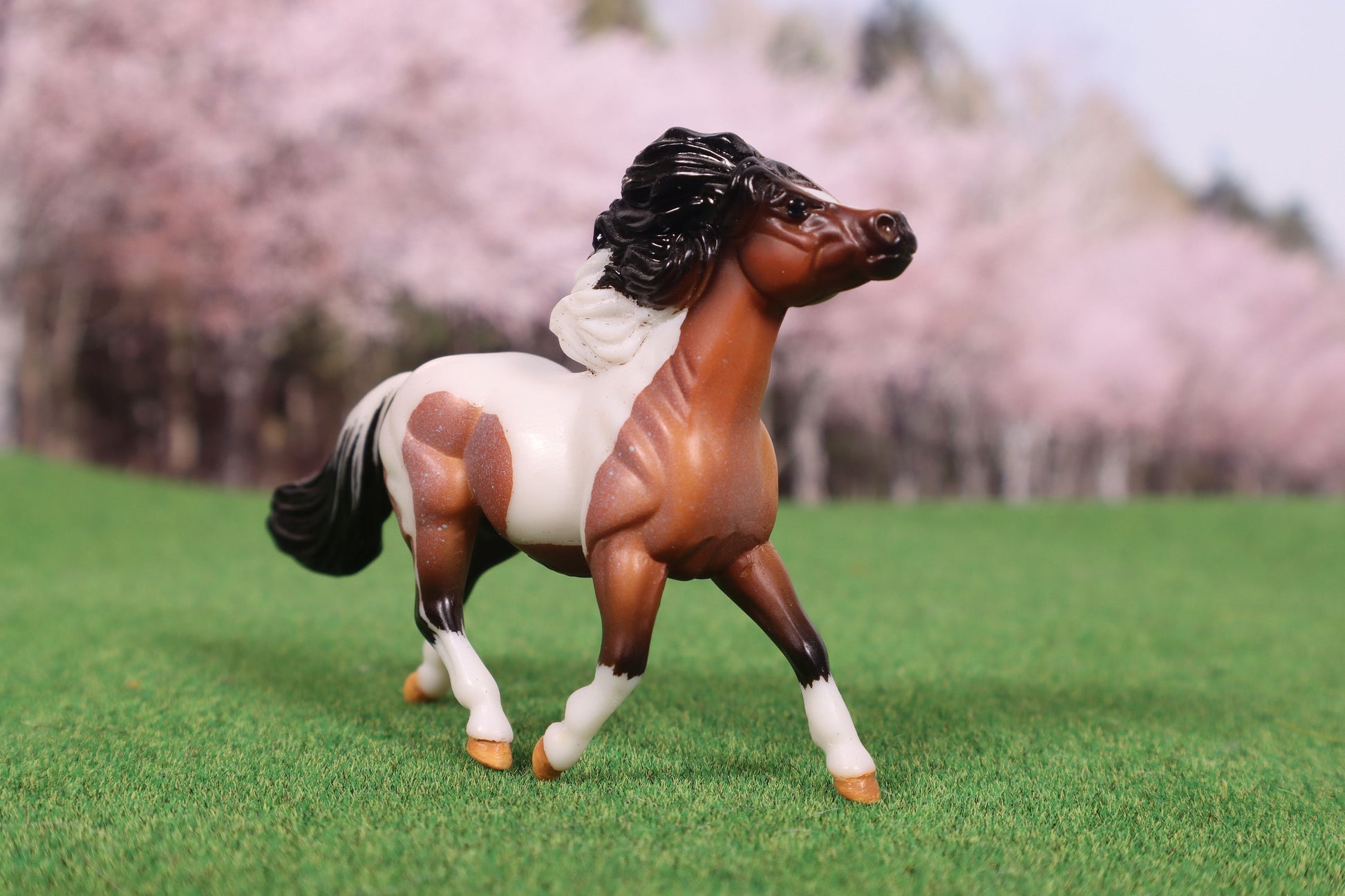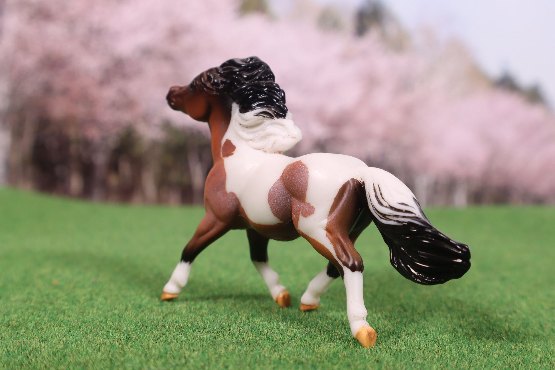 This model started as the Breyer Stablemate G2 Pony in bay roan. I etched him to a tobiano pinto pattern. I then added paint to detail his hooves. He was sprayed with a sealer to protect the painted detailing.