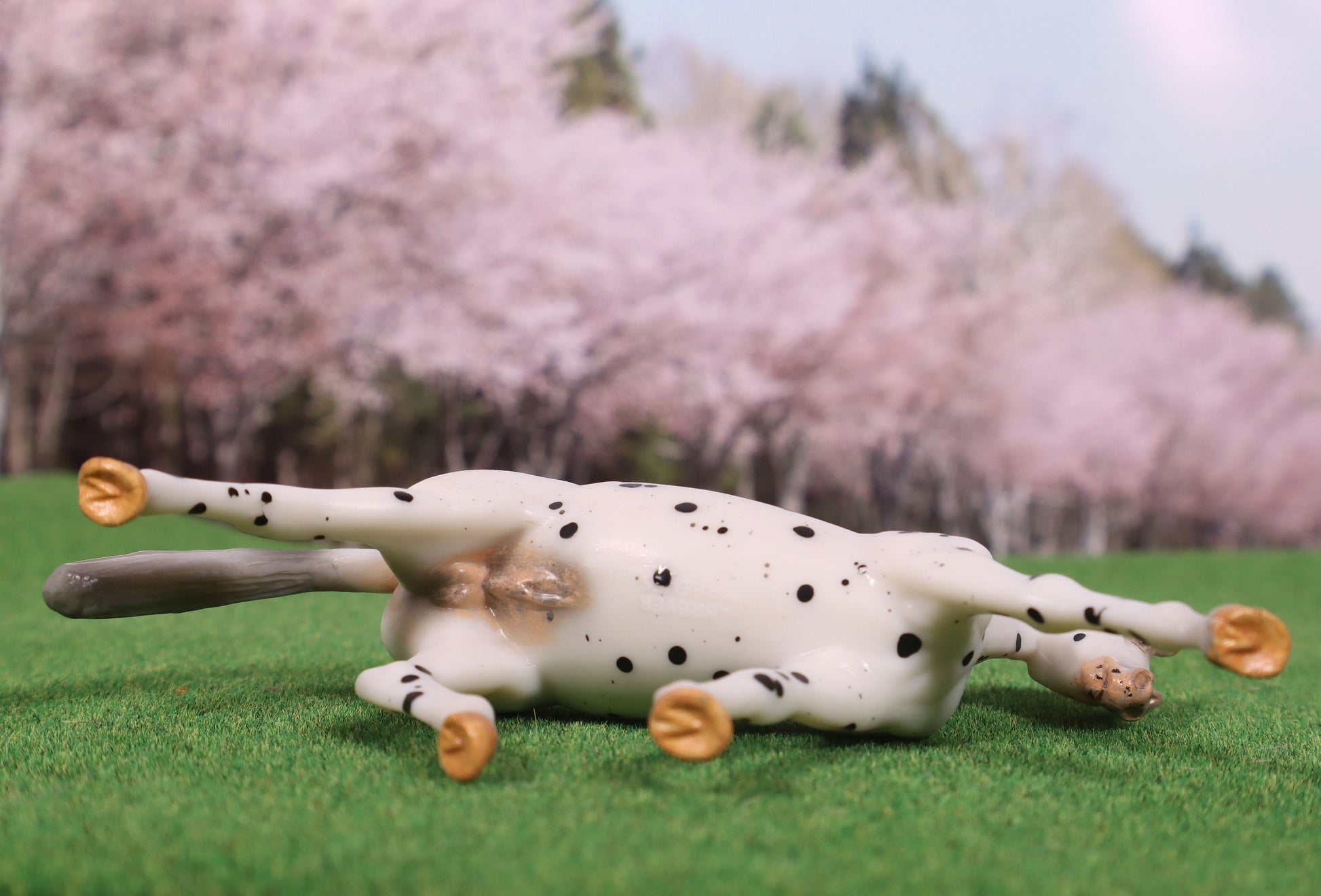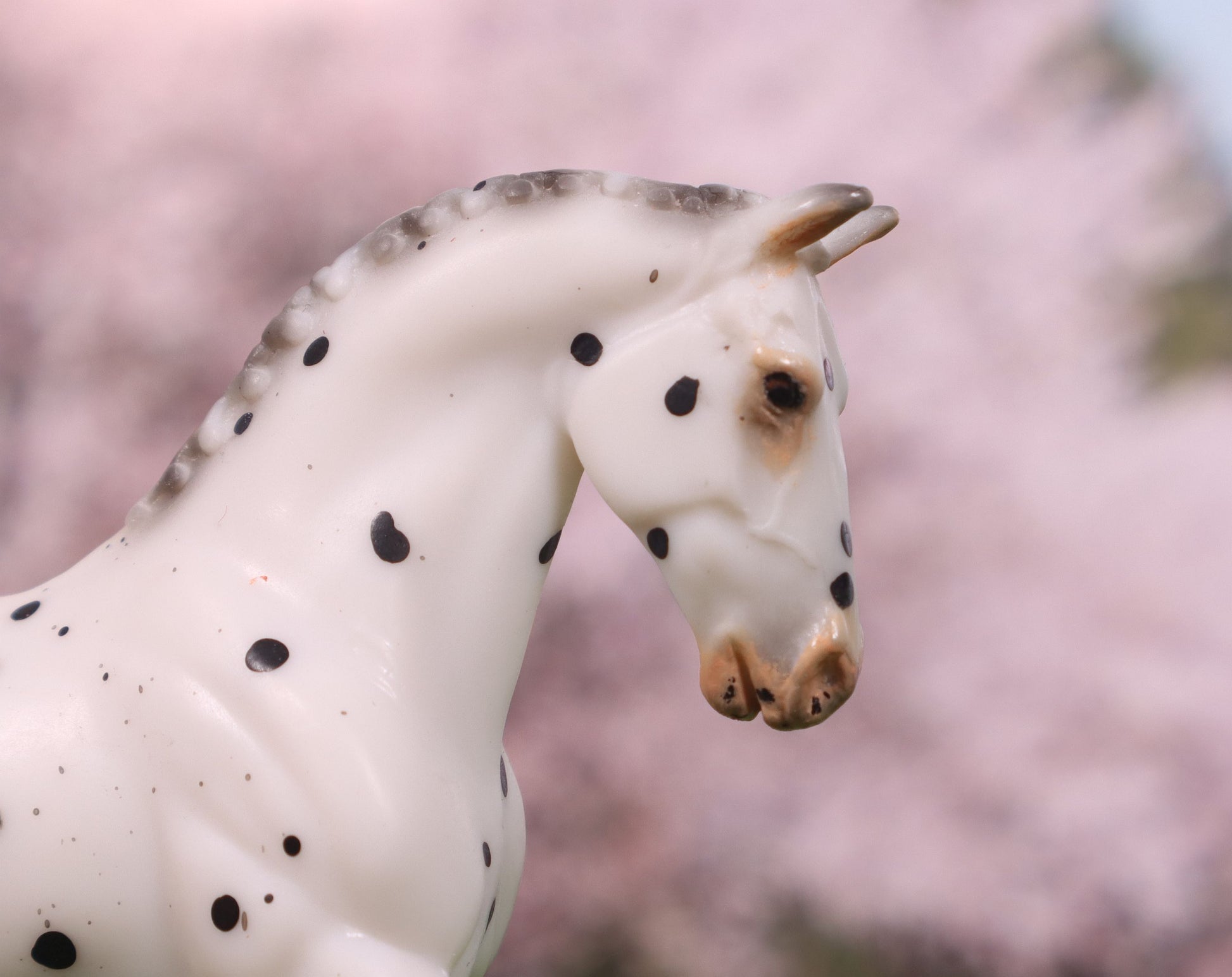 This model started as the Breyer Stablemate Hanoverian in black leopard appaloosa. I etched some of the spots off, creating a snowcap pattern. I then added paint for details, including mottled skin, striped hooves, eyes, and ears. He has one blue eye. He was sprayed with a sealer to protect the painted detailing.