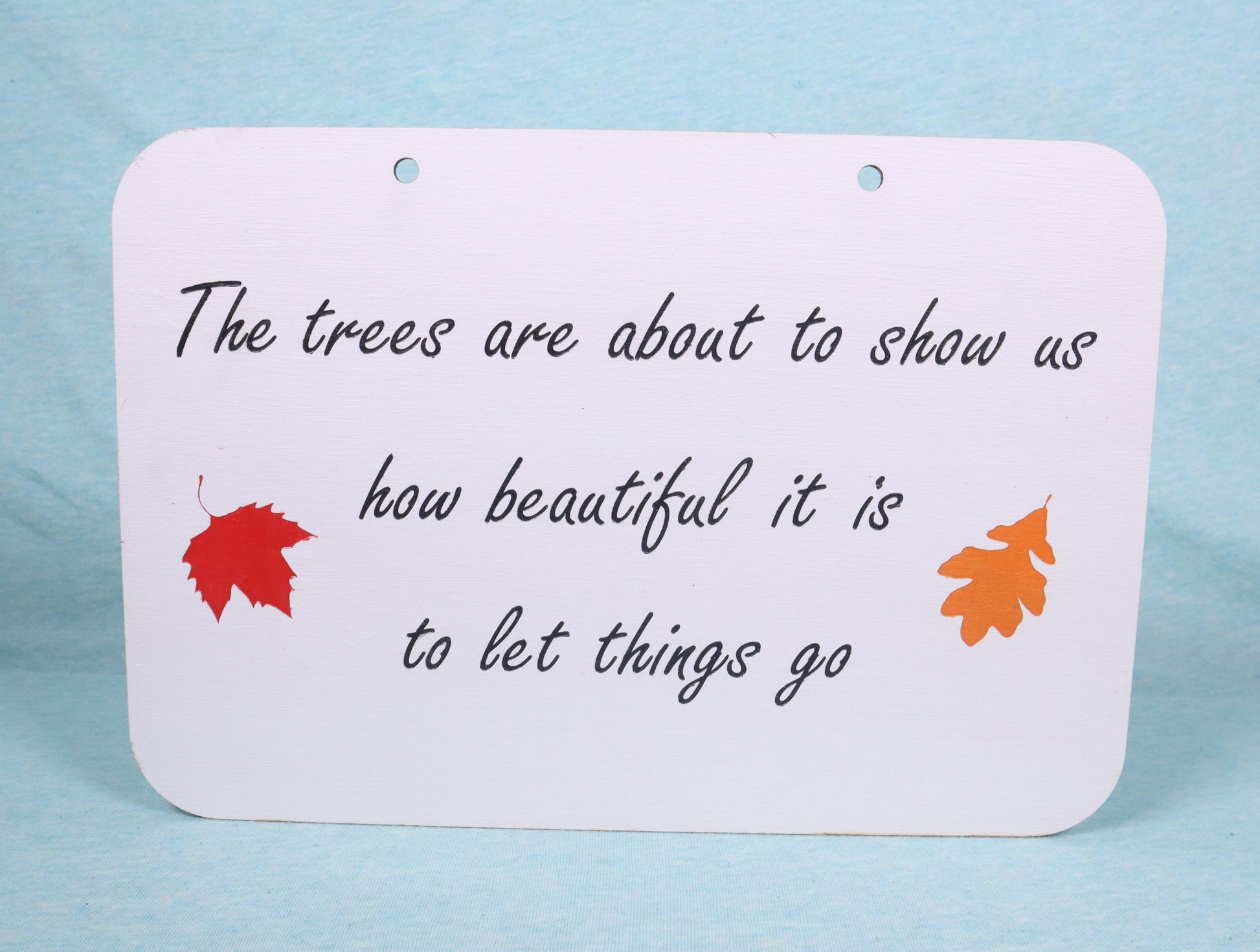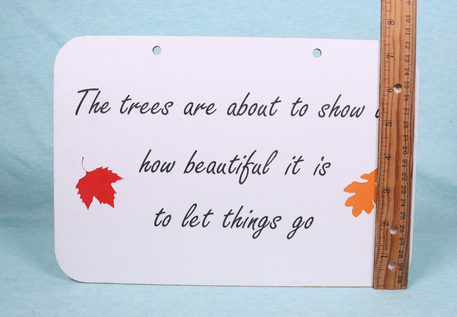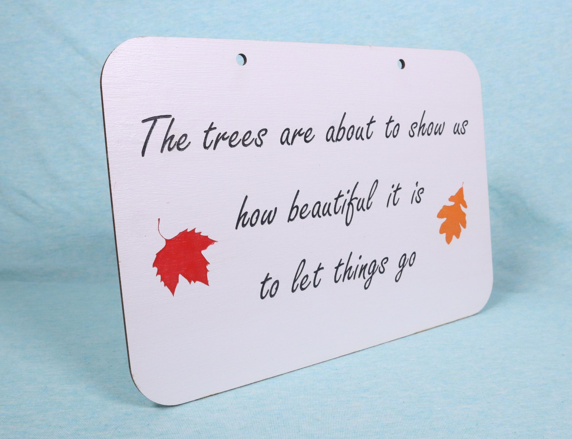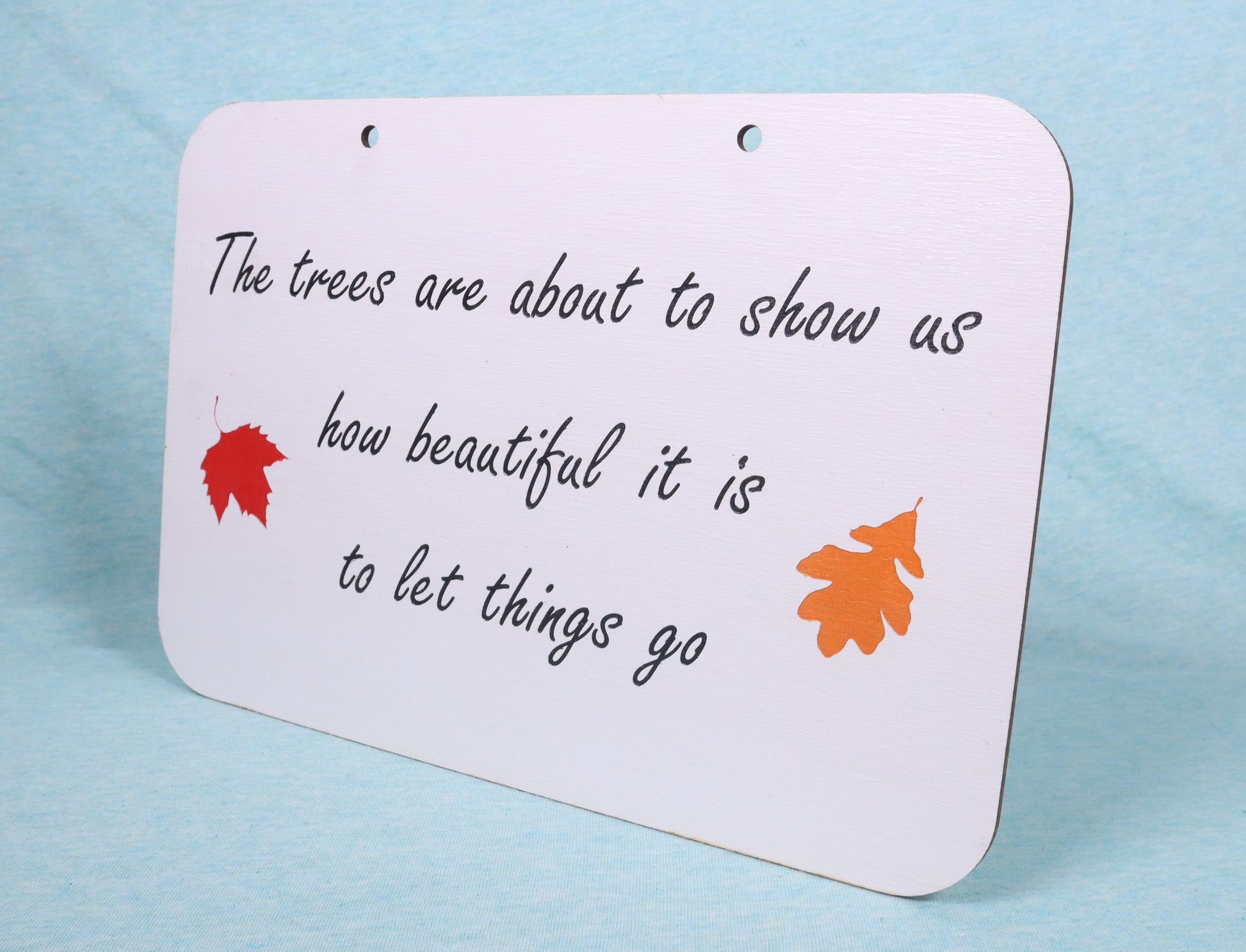 This beautiful sign says: "The trees are about to show us how beautiful it is to let things go", with one colorful autumn leaf on the left side and another on the right side.
