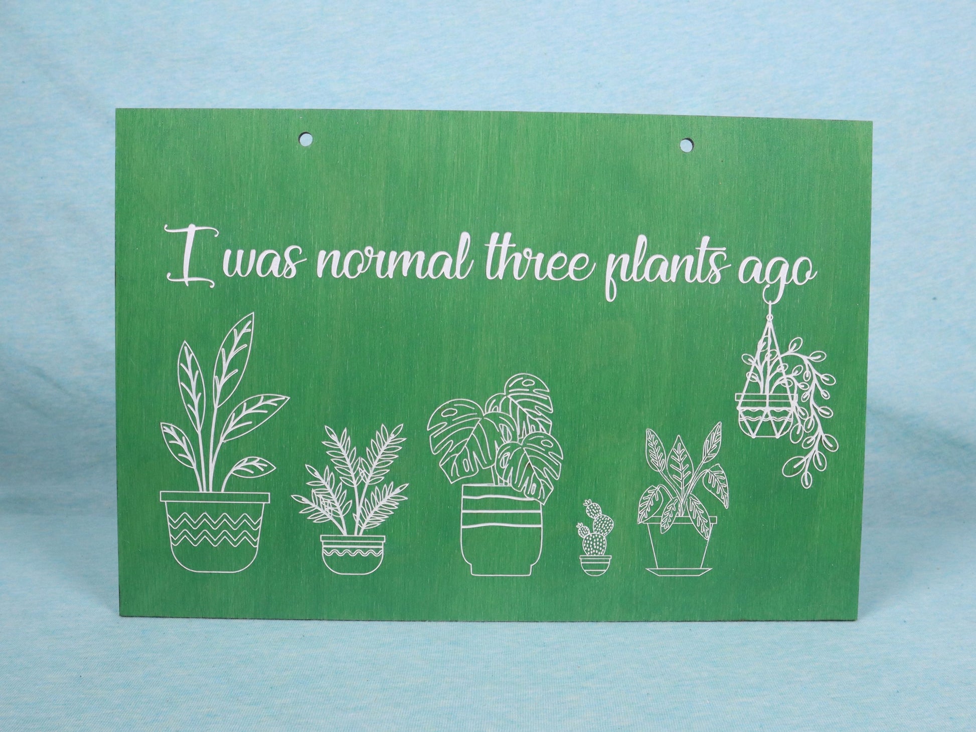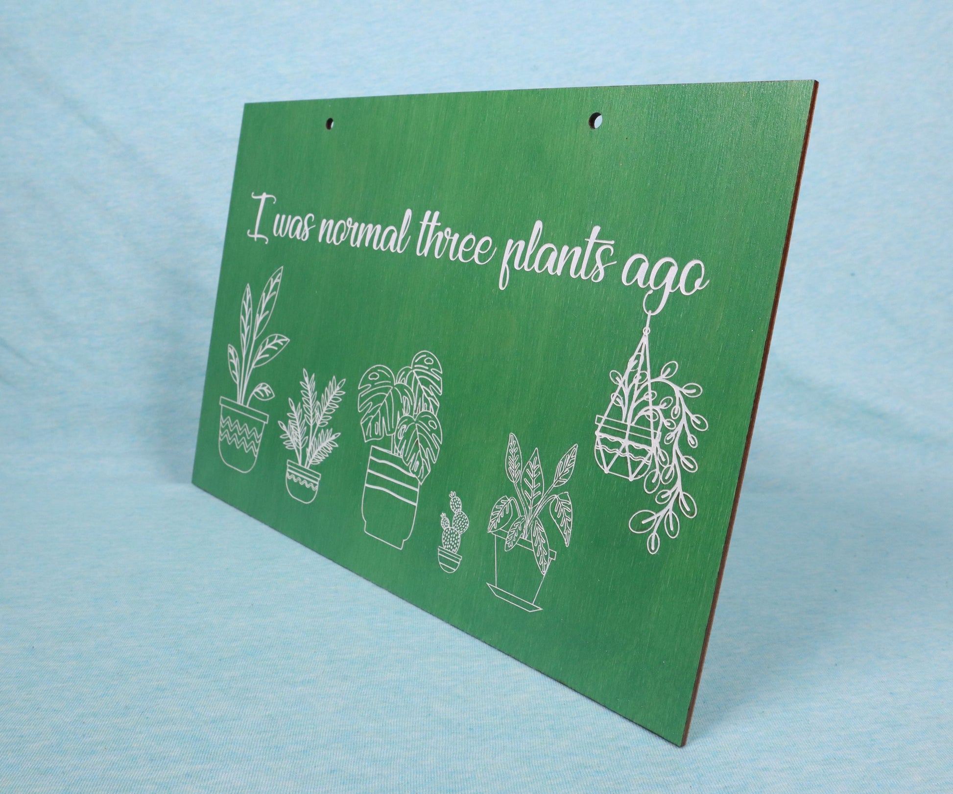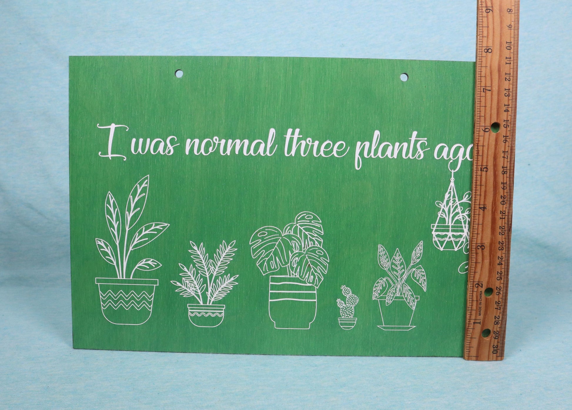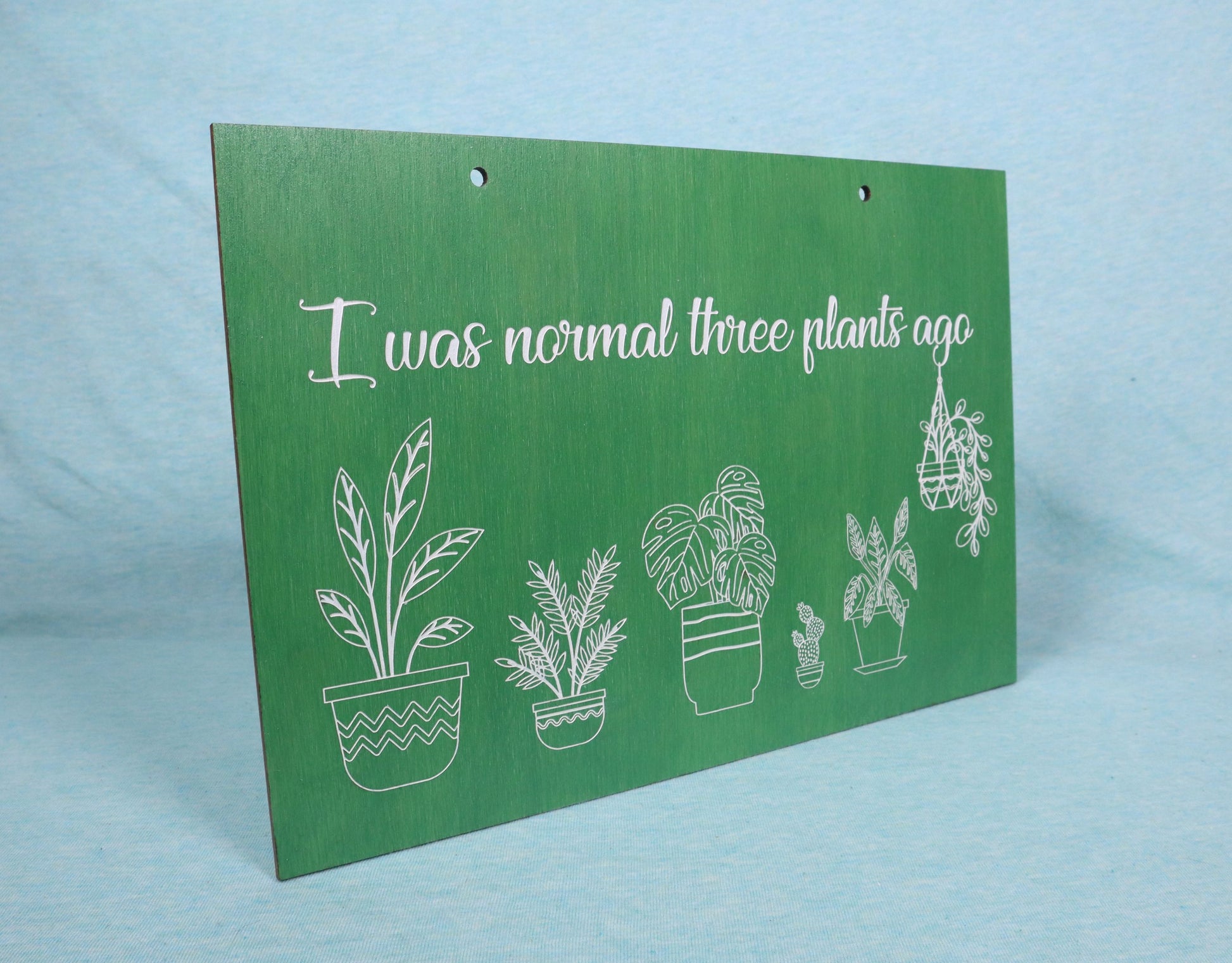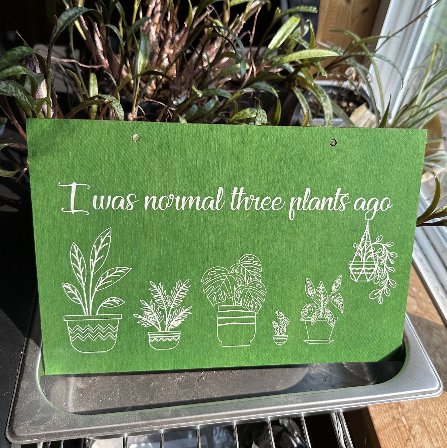This quirky sign says: "I was normal three plants ago" with a variety of potted plants across the bottom and one even hanging from the last word above.