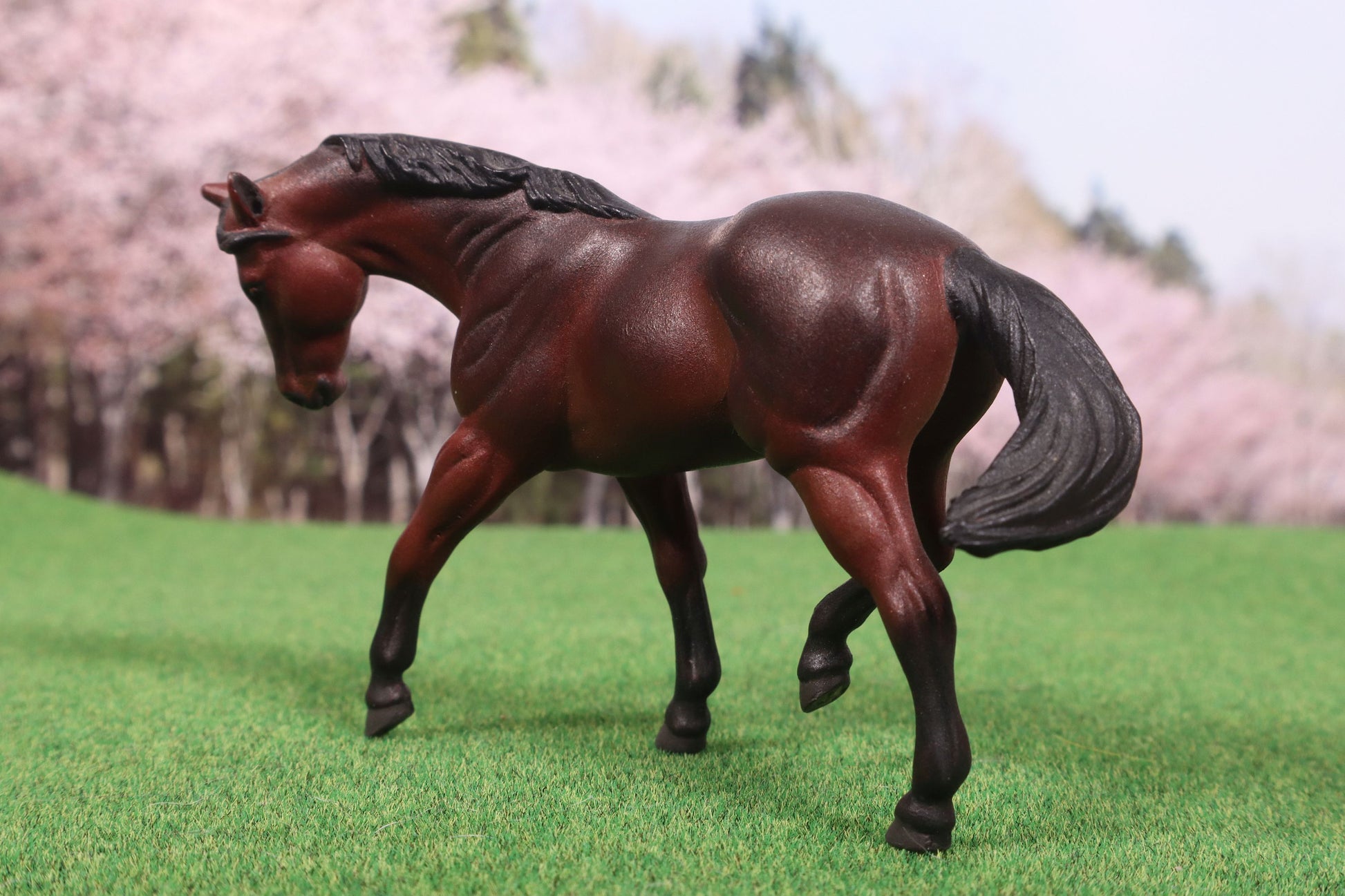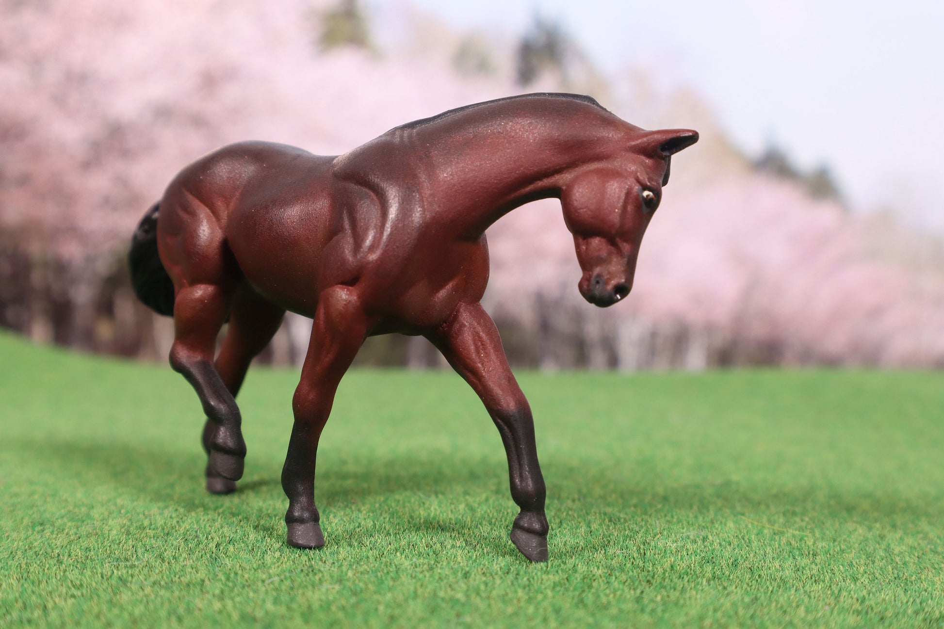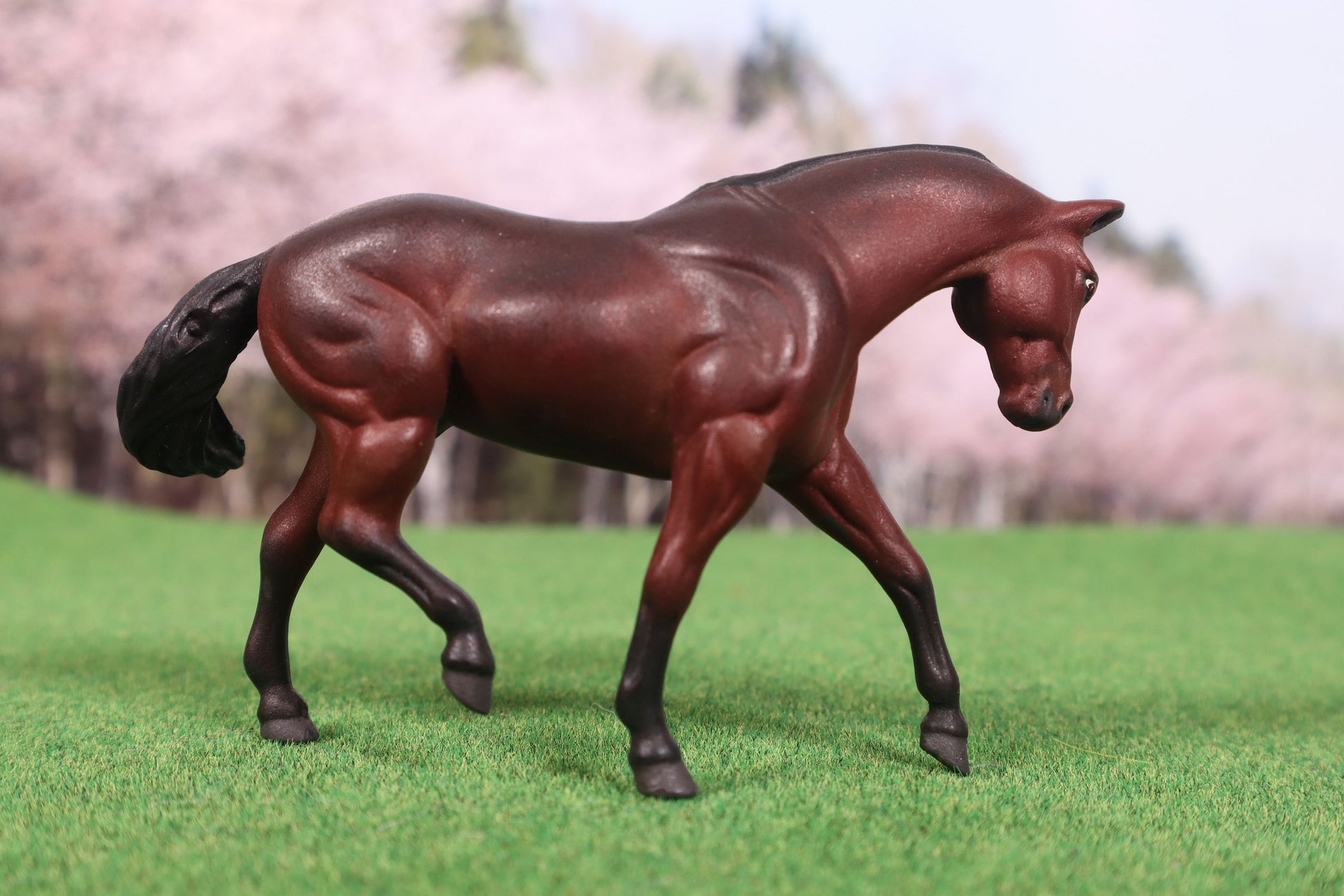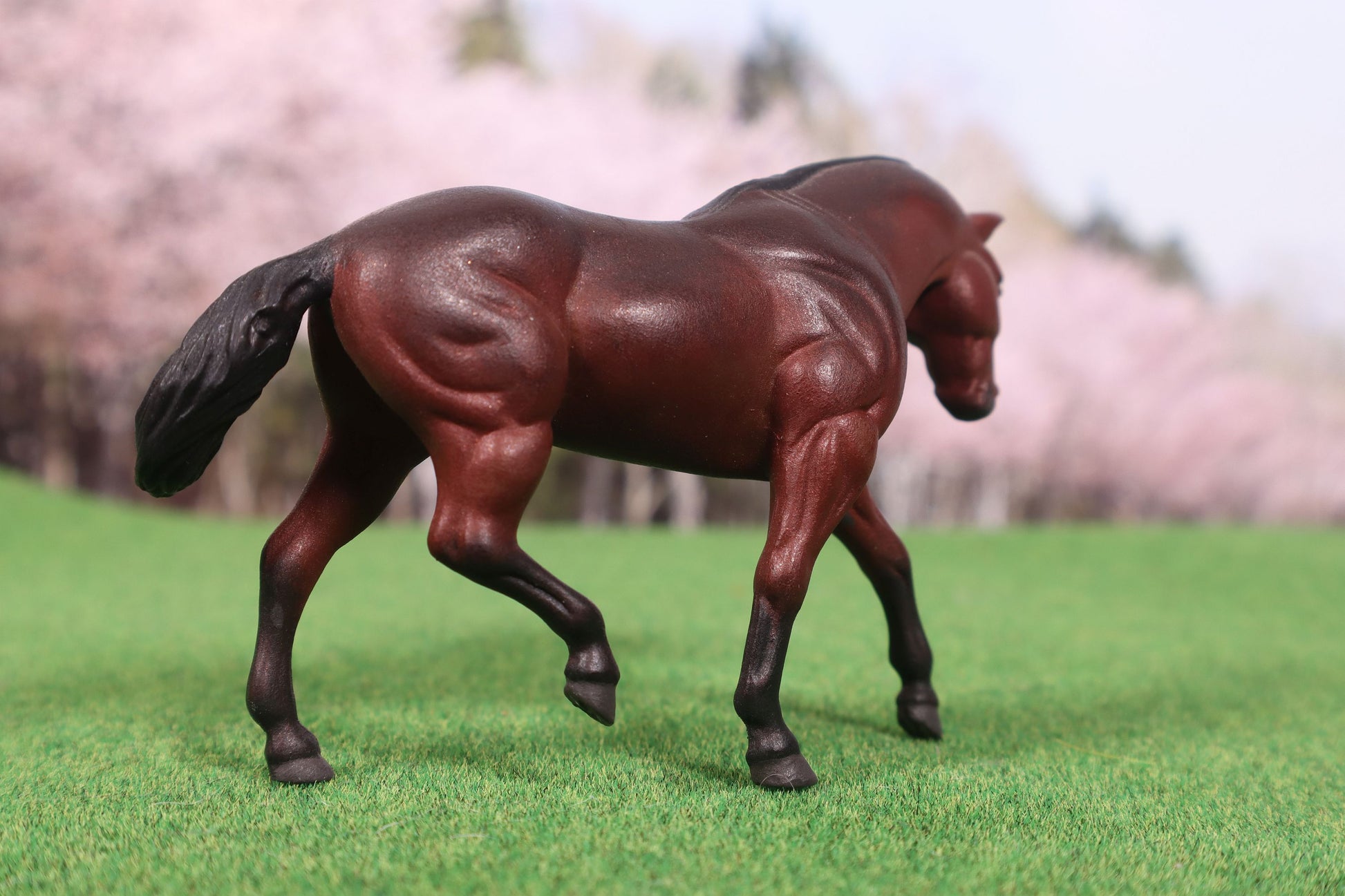I lowered his tail to a more relaxed swishing pose and carved his ears and tail. He was painted to a beautiful dark red bay, with detailed eyes and hooves.