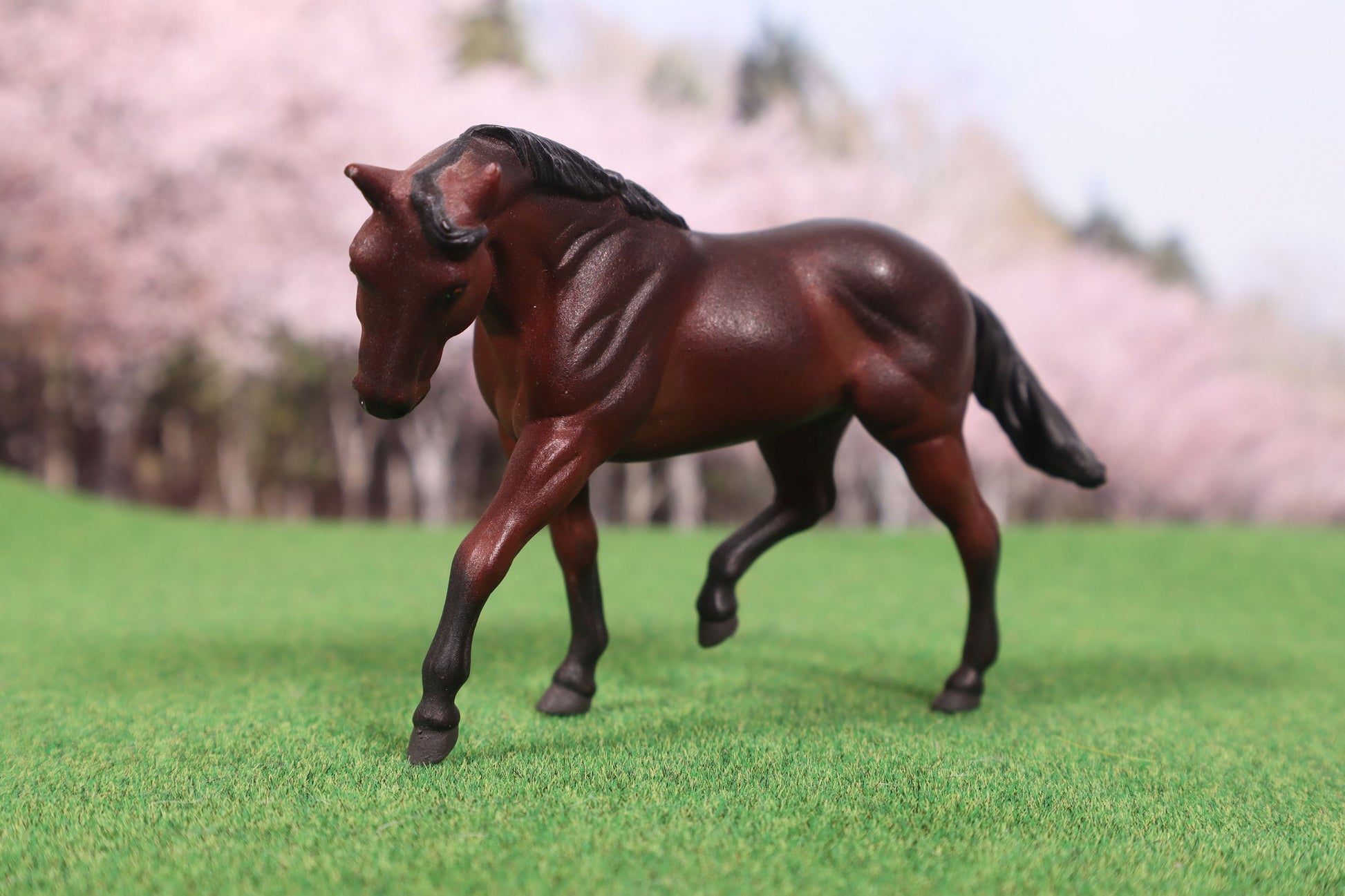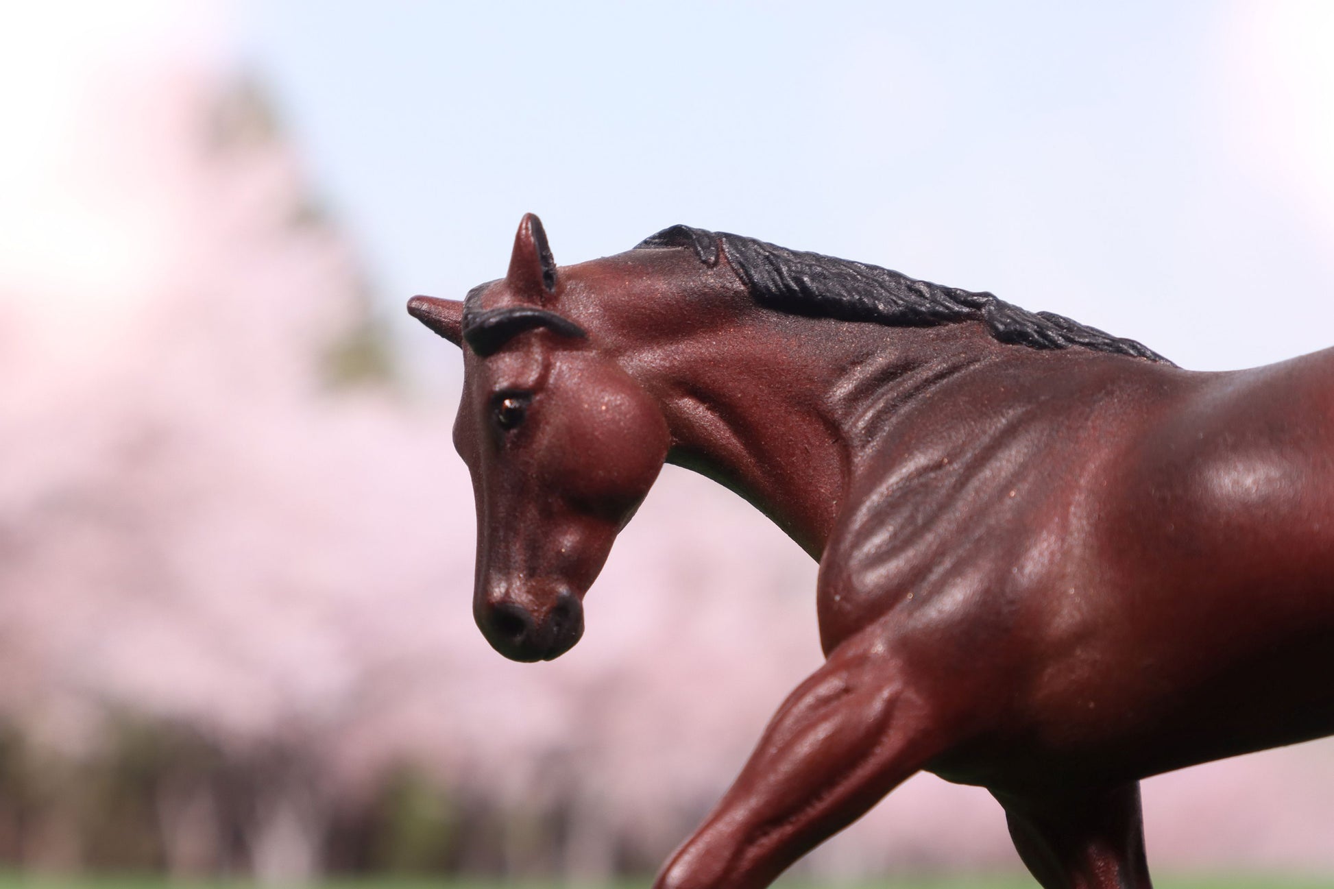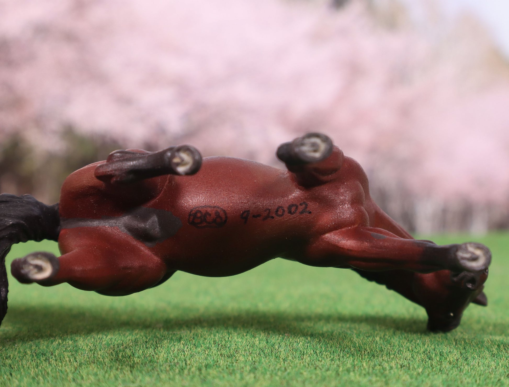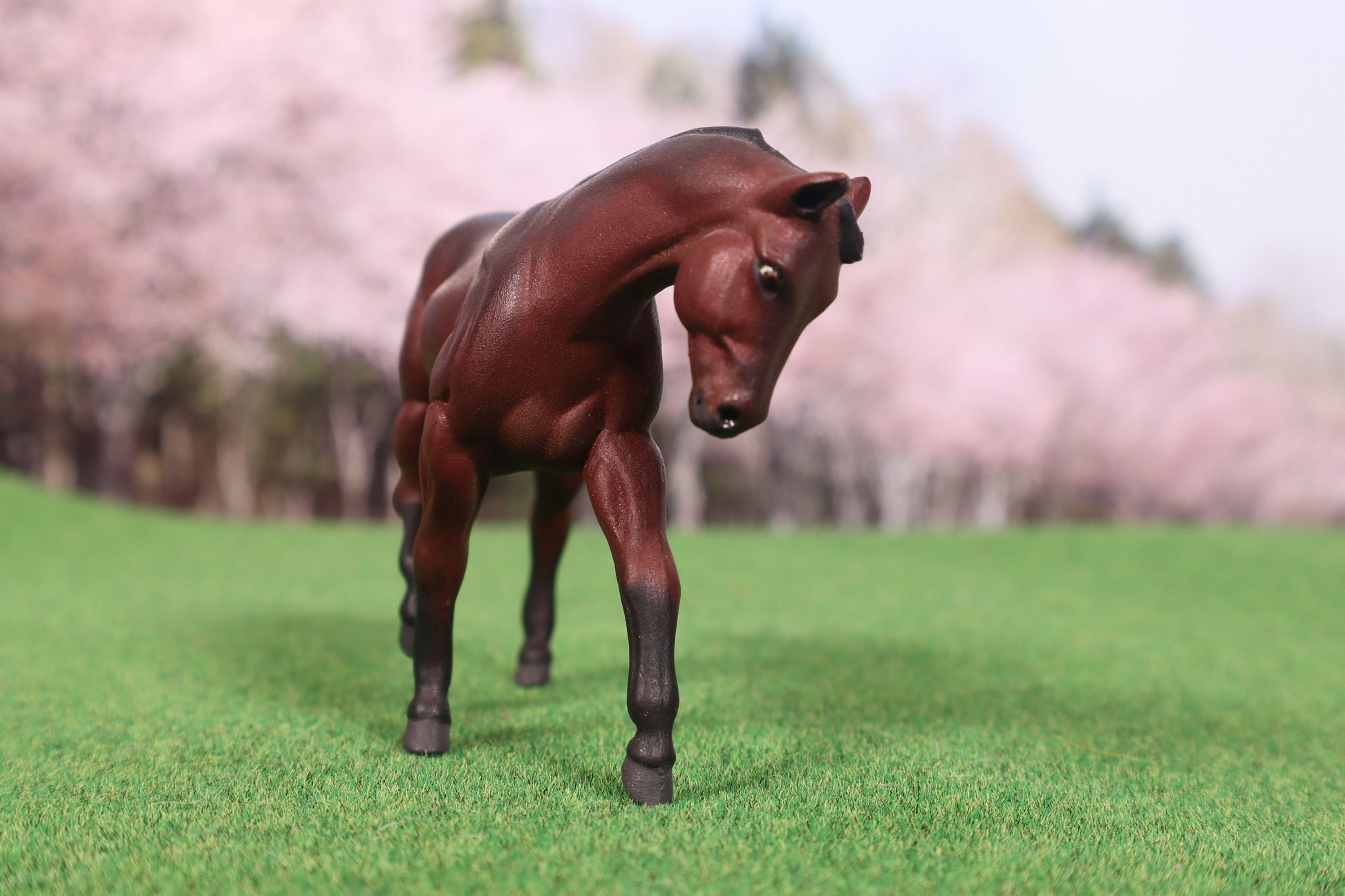 I lowered his tail to a more relaxed swishing pose and carved his ears and tail. He was painted to a beautiful dark red bay, with detailed eyes and hooves.